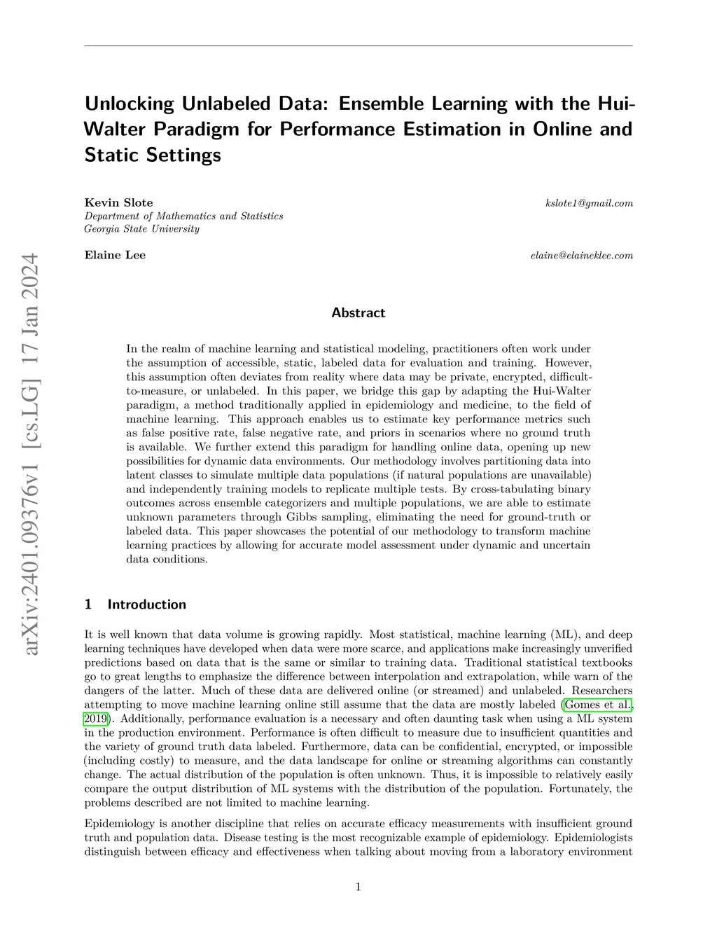 In the realm of machine learning and statistical modeling, practitioners often work under the assumption of accessible, static, labeled data for evaluation and training. However, this assumption often deviates from reality where data may be private, encrypted, difficult- to-measure, or unlabeled. In this paper, we bridge this gap by adapting the Hui-Walter paradigm, a method traditionally applied in epidemiology and medicine, to the field of machine learning. This approach enables us to estimate key performance metrics such as false positive rate, false negative rate, and priors in scenarios where no ground truth is available. We further extend this paradigm for handling online data, opening up new possibilities for dynamic data environments. Our methodology involves partitioning data into latent classes to simulate multiple data populations (if natural populations are unavailable) and independently training models to replicate multiple tests. By cross-tabulating binary outcomes across ensemble categorizers and multiple populations, we are able to estimate unknown parameters through Gibbs sampling, eliminating the need for ground-truth or labeled data. This paper showcases the potential of our methodology to transform machine learning practices by allowing for accurate model assessment under dynamic and uncertain data conditions.