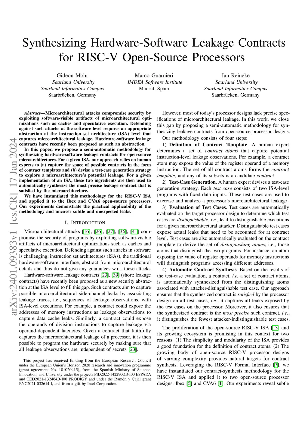 Microarchitectural attacks compromise security by exploiting software-visible artifacts of microarchitectural optimizations such as caches and speculative execution. Defending against such attacks at the software level requires an appropriate abstraction at the instruction set architecture (ISA) level that captures microarchitectural leakage. Hardware-software leakage contracts have recently been proposed as such an abstraction. In this paper, we propose a semi-automatic methodology for synthesizing hardware-software leakage contracts for open-source microarchitectures. For a given ISA, our approach relies on human experts to (a) capture the space of possible contracts in the form of contract templates and (b) devise a test-case generation strategy to explore a microarchitecture's potential leakage. For a given implementation of an ISA, these two ingredients are then used to automatically synthesize the most precise leakage contract that is satisfied by the microarchitecture. We have instantiated this methodology for the RISC-V ISA and applied it to the Ibex and CVA6 open-source processors. Our experiments demonstrate the practical applicability of the methodology and uncover subtle and unexpected leaks.