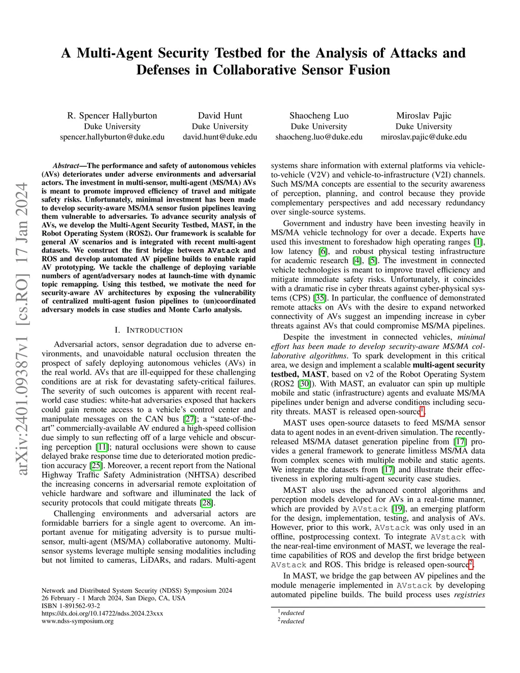 The performance and safety of autonomous vehicles (AVs) deteriorates under adverse environments and adversarial actors. The investment in multi-sensor, multi-agent (MSMA) AVs is meant to promote improved efficiency of travel and mitigate safety risks. Unfortunately, minimal investment has been made to develop security-aware MSMA sensor fusion pipelines leaving them vulnerable to adversaries. To advance security analysis of AVs, we develop the Multi-Agent Security Testbed, MAST, in the Robot Operating System (ROS2). Our framework is scalable for general AV scenarios and is integrated with recent multi-agent datasets. We construct the first bridge between AVstack and ROS and develop automated AV pipeline builds to enable rapid AV prototyping. We tackle the challenge of deploying variable numbers of agent/adversary nodes at launch-time with dynamic topic remapping. Using this testbed, we motivate the need for security-aware AV architectures by exposing the vulnerability of centralized multi-agent fusion pipelines to (un)coordinated adversary models in case studies and Monte Carlo analysis.