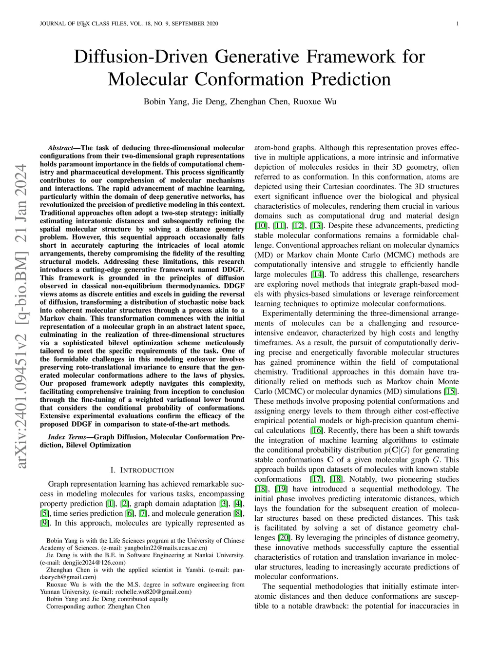The task of deducing three-dimensional molecular configurations from their two-dimensional graph representations holds paramount importance in the fields of computational chemistry and pharmaceutical development. The rapid advancement of machine learning, particularly within the domain of deep generative networks, has revolutionized the precision of predictive modeling in this context. Traditional approaches often adopt a two-step strategy: initially estimating interatomic distances and subsequently refining the spatial molecular structure by solving a distance geometry problem. However, this sequential approach occasionally falls short in accurately capturing the intricacies of local atomic arrangements, thereby compromising the fidelity of the resulting structural models. Addressing these limitations, this research introduces a cutting-edge generative framework named \method{}. This framework is grounded in the principles of diffusion observed in classical non-equilibrium thermodynamics. \method{} views atoms as discrete entities and excels in guiding the reversal of diffusion, transforming a distribution of stochastic noise back into coherent molecular structures through a process akin to a Markov chain. This transformation commences with the initial representation of a molecular graph in an abstract latent space, culminating in the realization of three-dimensional structures via a sophisticated bilevel optimization scheme meticulously tailored to meet the specific requirements of the task. One of the formidable challenges in this modeling endeavor involves preserving roto-translational invariance to ensure that the generated molecular conformations adhere to the laws of physics. Extensive experimental evaluations confirm the efficacy of the proposed \method{} in comparison to state-of-the-art methods.