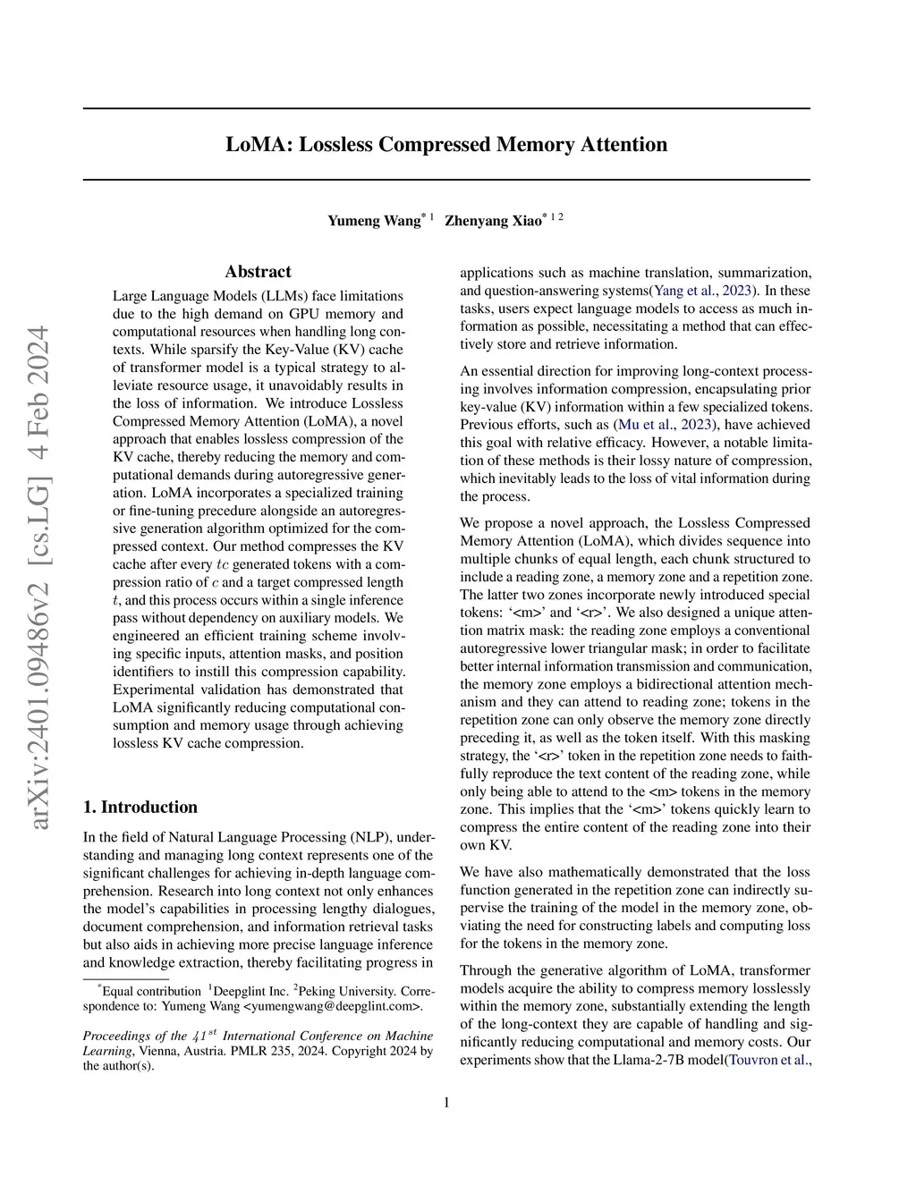 Large Language Models (LLMs) face limitations due to the high demand on GPU memory and computational resources when handling long contexts. While sparsify the Key-Value (KV) cache of transformer model is a typical strategy to alleviate resource usage, it unavoidably results in the loss of information. We introduce Lossless Compressed Memory Attention (LoMA), a novel approach that enables lossless compression of the KV cache, thereby reducing the memory and computational demands during autoregressive generation. LoMA incorporates a specialized training or fine-tuning precedure alongside an autoregressive generation algorithm optimized for the compressed context. Our method compresses the KV cache after every generated tokens with a compression ratio of and a target compressed length , and this process occurs within a single inference pass without dependency on auxiliary models. We engineered an efficient training scheme involving specific inputs, attention masks, and position identifiers to instill this compression capability. Experimental validation has demonstrated that LoMA significantly reducing computational consumption and memory usage through achieving lossless KV cache compression.