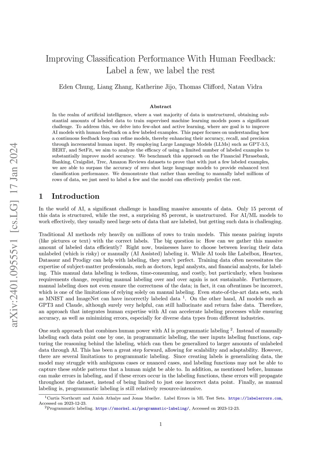 In the realm of artificial intelligence, where a vast majority of data is unstructured, obtaining substantial amounts of labeled data to train supervised machine learning models poses a significant challenge. To address this, we delve into few-shot and active learning, where are goal is to improve AI models with human feedback on a few labeled examples. This paper focuses on understanding how a continuous feedback loop can refine models, thereby enhancing their accuracy, recall, and precision through incremental human input. By employing Large Language Models (LLMs) such as GPT-3.5, BERT, and SetFit, we aim to analyze the efficacy of using a limited number of labeled examples to substantially improve model accuracy. We benchmark this approach on the Financial Phrasebank, Banking, Craigslist, Trec, Amazon Reviews datasets to prove that with just a few labeled examples, we are able to surpass the accuracy of zero shot large language models to provide enhanced text classification performance. We demonstrate that rather than needing to manually label millions of rows of data, we just need to label a few and the model can effectively predict the rest.