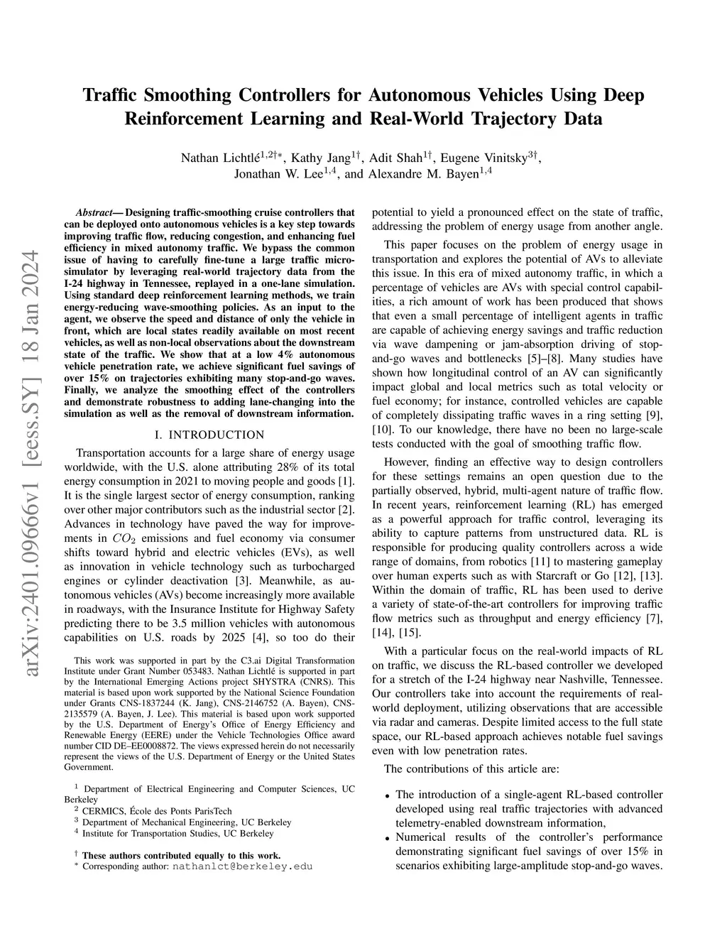 Designing traffic-smoothing cruise controllers that can be deployed onto autonomous vehicles is a key step towards improving traffic flow, reducing congestion, and enhancing fuel efficiency in mixed autonomy traffic. We bypass the common issue of having to carefully fine-tune a large traffic microsimulator by leveraging real-world trajectory data from the I-24 highway in Tennessee, replayed in a one-lane simulation. Using standard deep reinforcement learning methods, we train energy-reducing wave-smoothing policies. As an input to the agent, we observe the speed and distance of only the vehicle in front, which are local states readily available on most recent vehicles, as well as non-local observations about the downstream state of the traffic. We show that at a low 4% autonomous vehicle penetration rate, we achieve significant fuel savings of over 15% on trajectories exhibiting many stop-and-go waves. Finally, we analyze the smoothing effect of the controllers and demonstrate robustness to adding lane-changing into the simulation as well as the removal of downstream information.