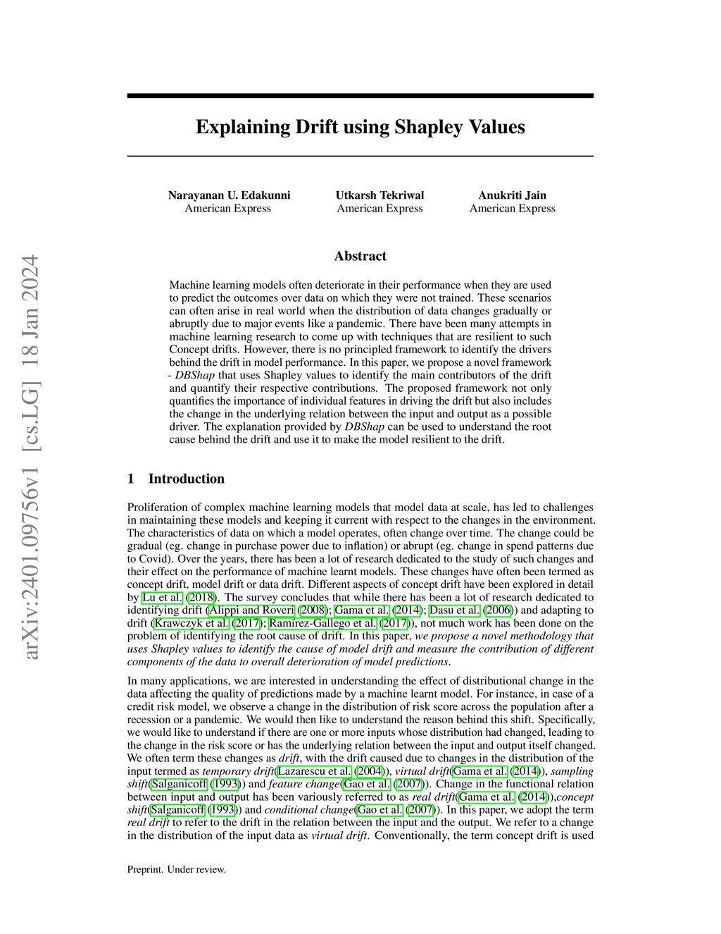 Machine learning models often deteriorate in their performance when they are used to predict the outcomes over data on which they were not trained. These scenarios can often arise in real world when the distribution of data changes gradually or abruptly due to major events like a pandemic. There have been many attempts in machine learning research to come up with techniques that are resilient to such Concept drifts. However, there is no principled framework to identify the drivers behind the drift in model performance. In this paper, we propose a novel framework - DBShap that uses Shapley values to identify the main contributors of the drift and quantify their respective contributions. The proposed framework not only quantifies the importance of individual features in driving the drift but also includes the change in the underlying relation between the input and output as a possible driver. The explanation provided by DBShap can be used to understand the root cause behind the drift and use it to make the model resilient to the drift.