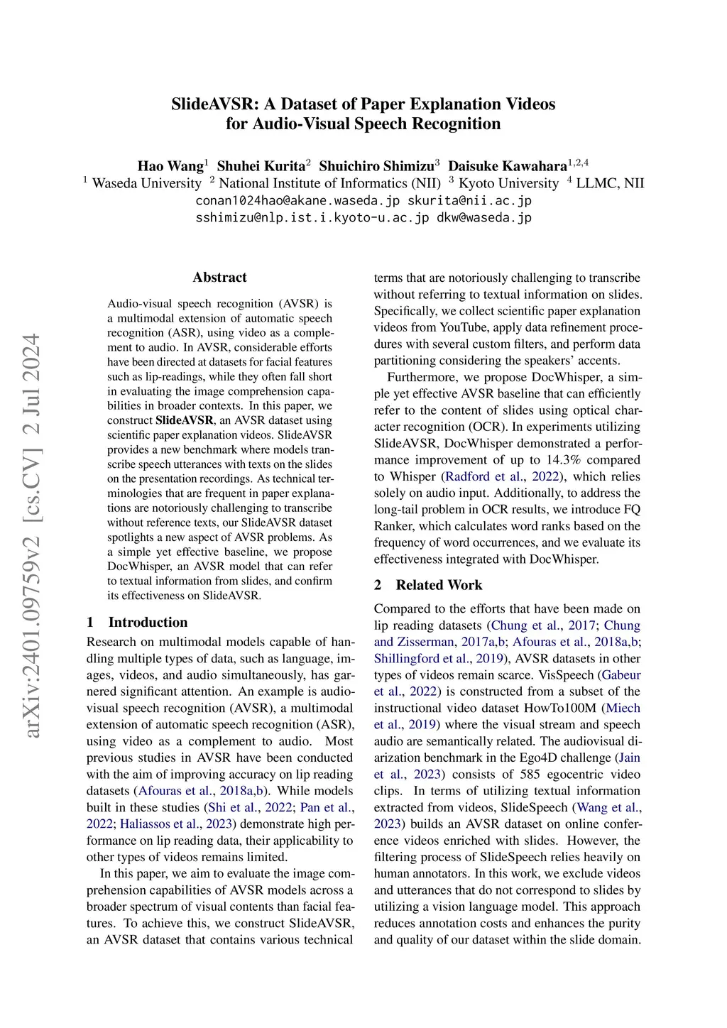 SlideAVSR: A Dataset of Paper Explanation Videos for Audio-Visual Speech