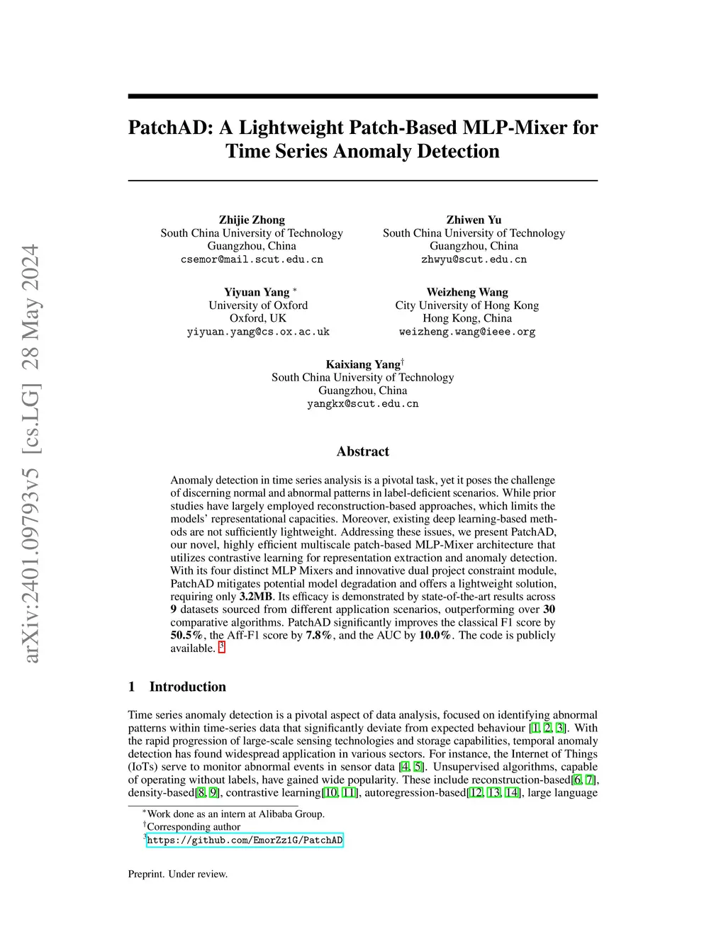 Anomaly detection in time series analysis is a pivotal task, yet it poses the challenge of discerning normal and abnormal patterns in label-deficient scenarios. While prior studies have largely employed reconstruction-based approaches, which limits the models' representational capacities. Moreover, existing deep learning-based methods are not sufficiently lightweight. Addressing these issues, we present PatchAD, our novel, highly efficient multiscale patch-based MLP-Mixer architecture that utilizes contrastive learning for representation extraction and anomaly detection. With its four distinct MLP Mixers and innovative dual project constraint module, PatchAD mitigates potential model degradation and offers a lightweight solution, requiring only MB. Its efficacy is demonstrated by state-of-the-art results across datasets sourced from different application scenarios, outperforming over comparative algorithms. PatchAD significantly improves the classical F1 score by , the Aff-F1 score by , and the AUC by . The code is publicly available. \url{https://github.com/EmorZz1G/PatchAD}
