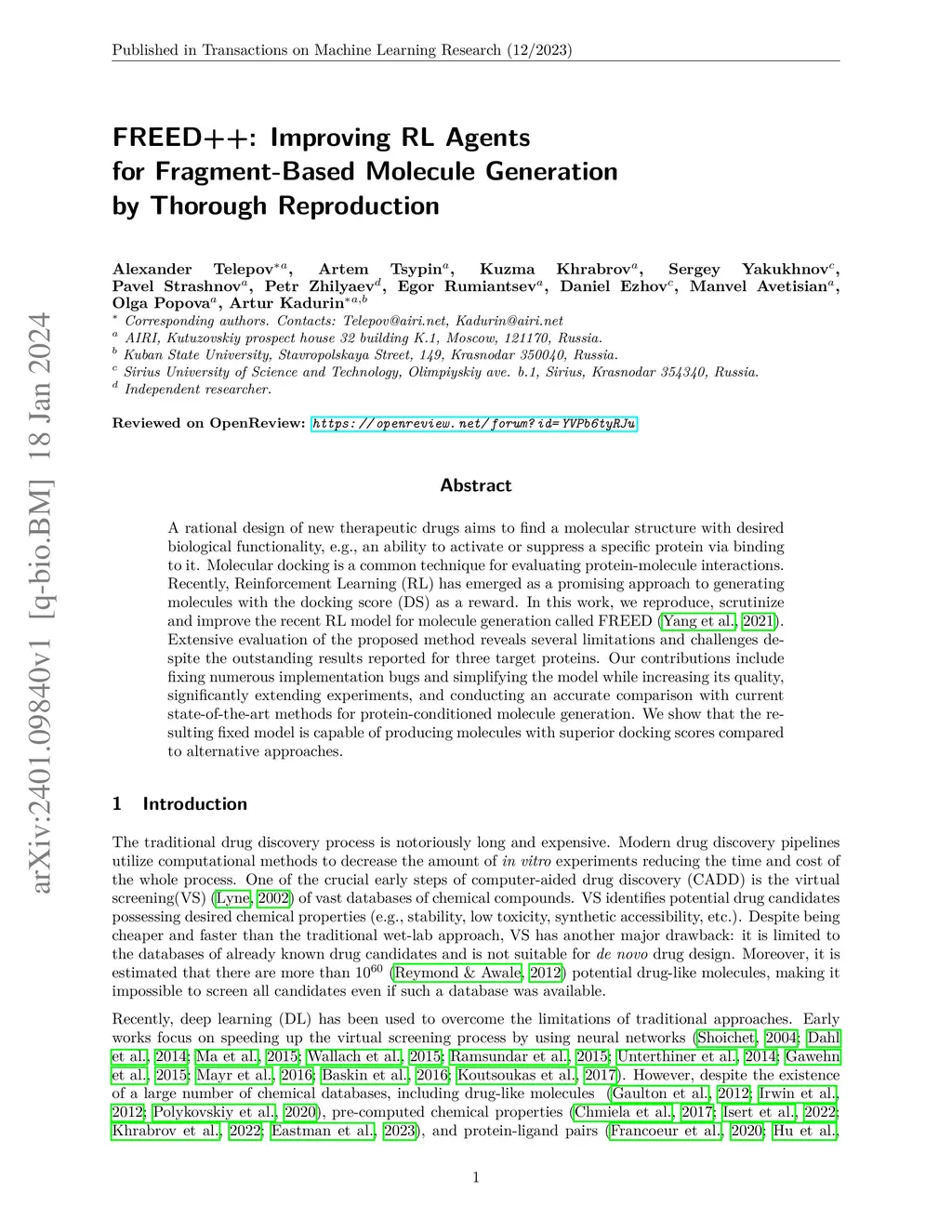 A rational design of new therapeutic drugs aims to find a molecular structure with desired biological functionality, e.g., an ability to activate or suppress a specific protein via binding to it. Molecular docking is a common technique for evaluating protein-molecule interactions. Recently, Reinforcement Learning (RL) has emerged as a promising approach to generating molecules with the docking score (DS) as a reward. In this work, we reproduce, scrutinize and improve the recent RL model for molecule generation called FREED (arXiv:2110.01219). Extensive evaluation of the proposed method reveals several limitations and challenges despite the outstanding results reported for three target proteins. Our contributions include fixing numerous implementation bugs and simplifying the model while increasing its quality, significantly extending experiments, and conducting an accurate comparison with current state-of-the-art methods for protein-conditioned molecule generation. We show that the resulting fixed model is capable of producing molecules with superior docking scores compared to alternative approaches.