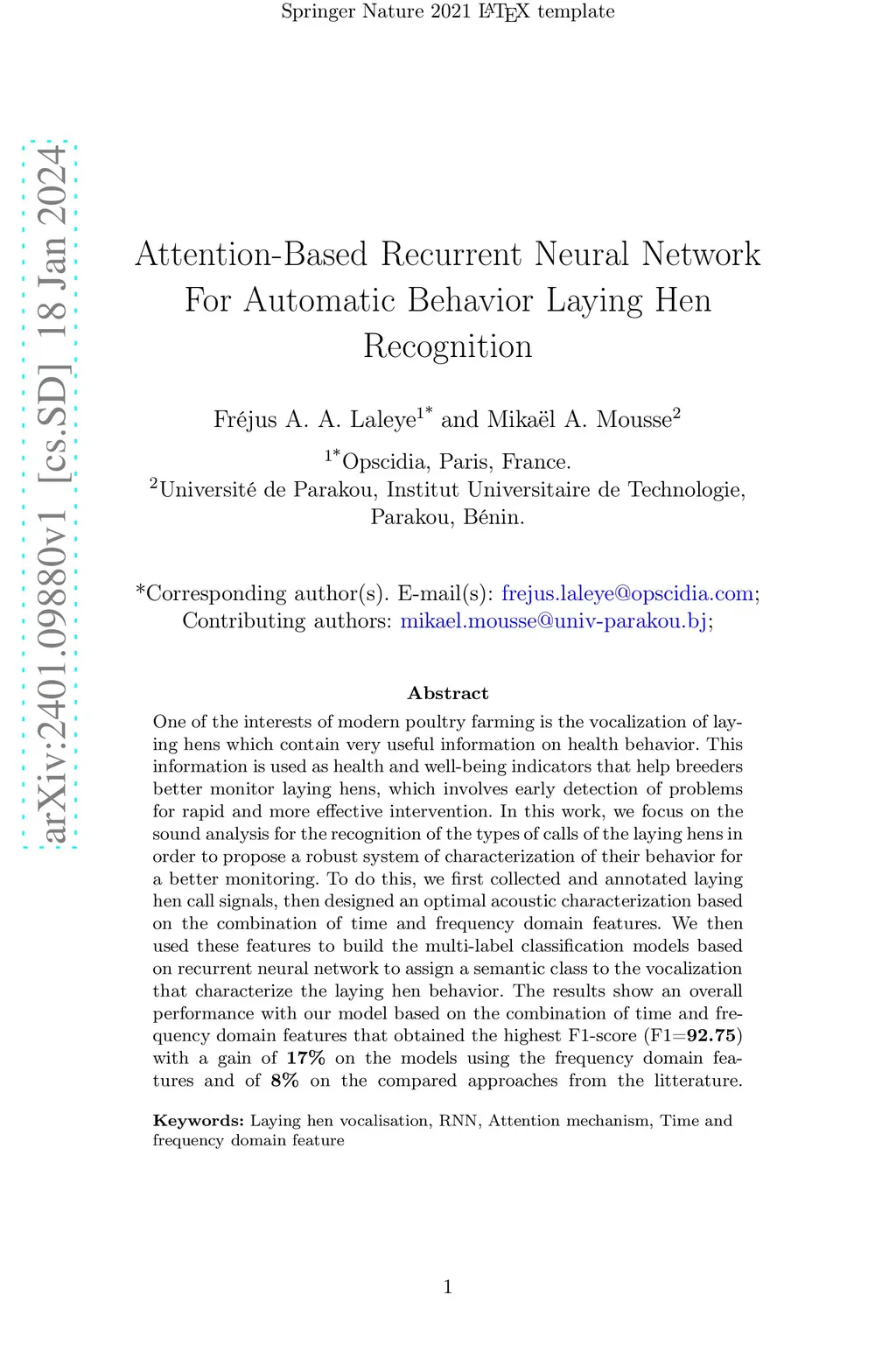 One of the interests of modern poultry farming is the vocalization of laying hens which contain very useful information on health behavior. This information is used as health and well-being indicators that help breeders better monitor laying hens, which involves early detection of problems for rapid and more effective intervention. In this work, we focus on the sound analysis for the recognition of the types of calls of the laying hens in order to propose a robust system of characterization of their behavior for a better monitoring. To do this, we first collected and annotated laying hen call signals, then designed an optimal acoustic characterization based on the combination of time and frequency domain features. We then used these features to build the multi-label classification models based on recurrent neural network to assign a semantic class to the vocalization that characterize the laying hen behavior. The results show an overall performance with our model based on the combination of time and frequency domain features that obtained the highest F1-score (F1=92.75) with a gain of 17% on the models using the frequency domain features and of 8% on the compared approaches from the litterature.