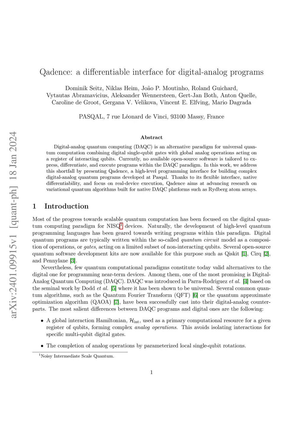 Digital-analog quantum computing (DAQC) is an alternative paradigm for universal quantum computation combining digital single-qubit gates with global analog operations acting on a register of interacting qubits. Currently, no available open-source software is tailored to express, differentiate, and execute programs within the DAQC paradigm. In this work, we address this shortfall by presenting Qadence, a high-level programming interface for building complex digital-analog quantum programs developed at Pasqal. Thanks to its flexible interface, native differentiability, and focus on real-device execution, Qadence aims at advancing research on variational quantum algorithms built for native DAQC platforms such as Rydberg atom arrays.