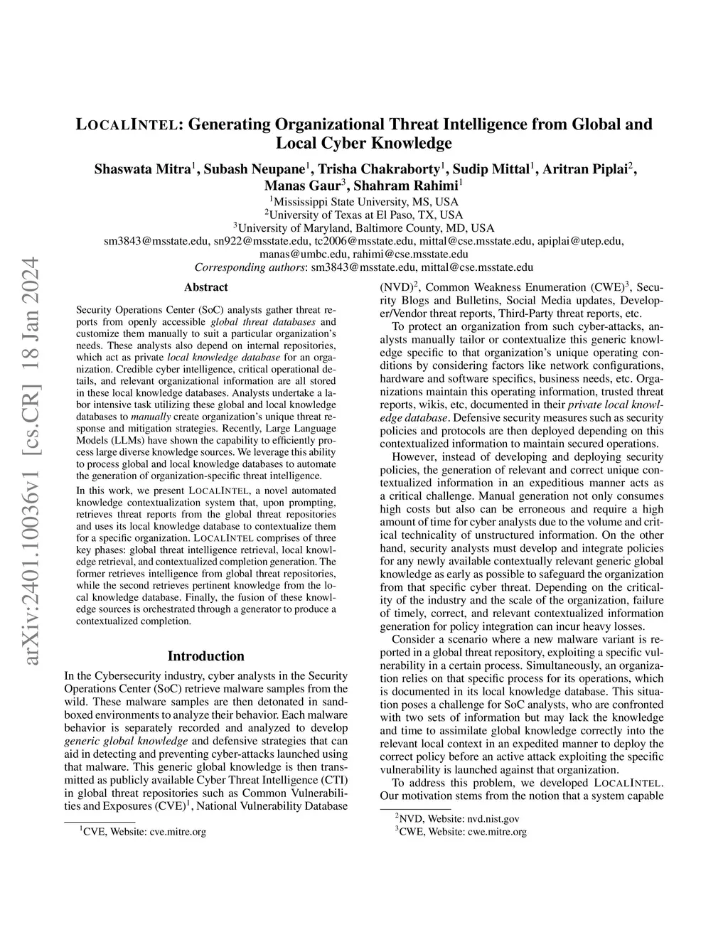 Security Operations Center (SoC) analysts gather threat reports from openly accessible global threat repositories and tailor the information to their organization's needs, such as developing threat intelligence and security policies. They also depend on organizational internal repositories, which act as private local knowledge database. These local knowledge databases store credible cyber intelligence, critical operational and infrastructure details. SoCs undertake a manual labor-intensive task of utilizing these global threat repositories and local knowledge databases to create both organization-specific threat intelligence and mitigation policies. Recently, Large Language Models (LLMs) have shown the capability to process diverse knowledge sources efficiently. We leverage this ability to automate this organization-specific threat intelligence generation. We present LocalIntel, a novel automated threat intelligence contextualization framework that retrieves zero-day vulnerability reports from the global threat repositories and uses its local knowledge database to determine implications and mitigation strategies to alert and assist the SoC analyst. LocalIntel comprises two key phases: knowledge retrieval and contextualization. Quantitative and qualitative assessment has shown effectiveness in generating up to 93% accurate organizational threat intelligence with 64% inter-rater agreement.
