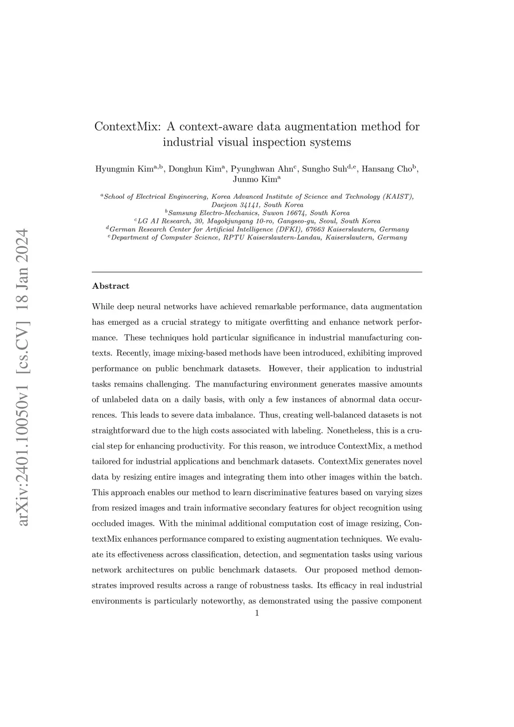 While deep neural networks have achieved remarkable performance, data augmentation has emerged as a crucial strategy to mitigate overfitting and enhance network performance. These techniques hold particular significance in industrial manufacturing contexts. Recently, image mixing-based methods have been introduced, exhibiting improved performance on public benchmark datasets. However, their application to industrial tasks remains challenging. The manufacturing environment generates massive amounts of unlabeled data on a daily basis, with only a few instances of abnormal data occurrences. This leads to severe data imbalance. Thus, creating well-balanced datasets is not straightforward due to the high costs associated with labeling. Nonetheless, this is a crucial step for enhancing productivity. For this reason, we introduce ContextMix, a method tailored for industrial applications and benchmark datasets. ContextMix generates novel data by resizing entire images and integrating them into other images within the batch. This approach enables our method to learn discriminative features based on varying sizes from resized images and train informative secondary features for object recognition using occluded images. With the minimal additional computation cost of image resizing, ContextMix enhances performance compared to existing augmentation techniques. We evaluate its effectiveness across classification, detection, and segmentation tasks using various network architectures on public benchmark datasets. Our proposed method demonstrates improved results across a range of robustness tasks. Its efficacy in real industrial environments is particularly noteworthy, as demonstrated using the passive component dataset.