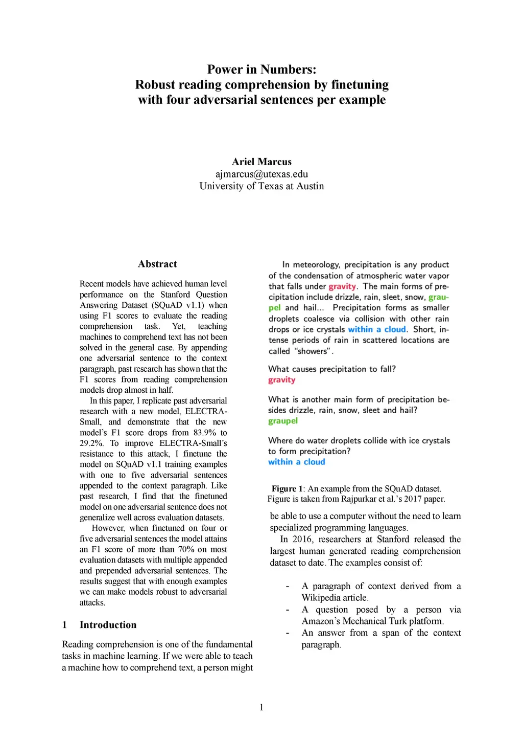 Recent models have achieved human level performance on the Stanford Question Answering Dataset when using F1 scores to evaluate the reading comprehension task. Yet, teaching machines to comprehend text has not been solved in the general case. By appending one adversarial sentence to the context paragraph, past research has shown that the F1 scores from reading comprehension models drop almost in half. In this paper, I replicate past adversarial research with a new model, ELECTRA-Small, and demonstrate that the new model's F1 score drops from 83.9% to 29.2%. To improve ELECTRA-Small's resistance to this attack, I finetune the model on SQuAD v1.1 training examples with one to five adversarial sentences appended to the context paragraph. Like past research, I find that the finetuned model on one adversarial sentence does not generalize well across evaluation datasets. However, when finetuned on four or five adversarial sentences the model attains an F1 score of more than 70% on most evaluation datasets with multiple appended and prepended adversarial sentences. The results suggest that with enough examples we can make models robust to adversarial attacks.