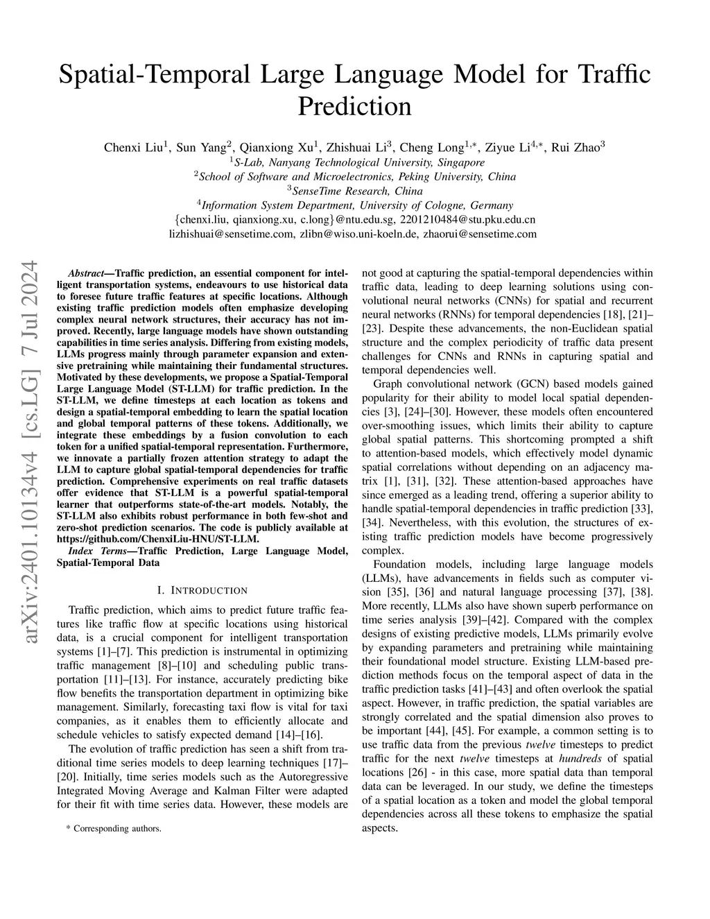 Traffic prediction, an essential component for intelligent transportation systems, endeavours to use historical data to foresee future traffic features at specific locations. Although existing traffic prediction models often emphasize developing complex neural network structures, their accuracy has not improved. Recently, large language models have shown outstanding capabilities in time series analysis. Differing from existing models, LLMs progress mainly through parameter expansion and extensive pretraining while maintaining their fundamental structures. Motivated by these developments, we propose a Spatial-Temporal Large Language Model (ST-LLM) for traffic prediction. In the ST-LLM, we define timesteps at each location as tokens and design a spatial-temporal embedding to learn the spatial location and global temporal patterns of these tokens. Additionally, we integrate these embeddings by a fusion convolution to each token for a unified spatial-temporal representation. Furthermore, we innovate a partially frozen attention strategy to adapt the LLM to capture global spatial-temporal dependencies for traffic prediction. Comprehensive experiments on real traffic datasets offer evidence that ST-LLM is a powerful spatial-temporal learner that outperforms state-of-the-art models. Notably, the ST-LLM also exhibits robust performance in both few-shot and zero-shot prediction scenarios. The code is publicly available at https://github.com/ChenxiLiu-HNU/ST-LLM.
