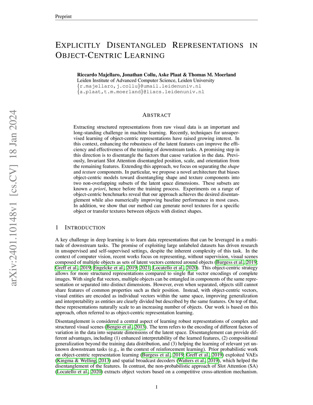Extracting structured representations from raw visual data is an important and long-standing challenge in machine learning. Recently, techniques for unsupervised learning of object-centric representations have raised growing interest. In this context, enhancing the robustness of the latent features can improve the efficiency and effectiveness of the training of downstream tasks. A promising step in this direction is to disentangle the factors that cause variation in the data. Previously, Invariant Slot Attention disentangled position, scale, and orientation from the remaining features. Extending this approach, we focus on separating the shape and texture components. In particular, we propose a novel architecture that biases object-centric models toward disentangling shape and texture components into two non-overlapping subsets of the latent space dimensions. These subsets are known a priori, hence before the training process. Experiments on a range of object-centric benchmarks reveal that our approach achieves the desired disentanglement while also numerically improving baseline performance in most cases. In addition, we show that our method can generate novel textures for a specific object or transfer textures between objects with distinct shapes.