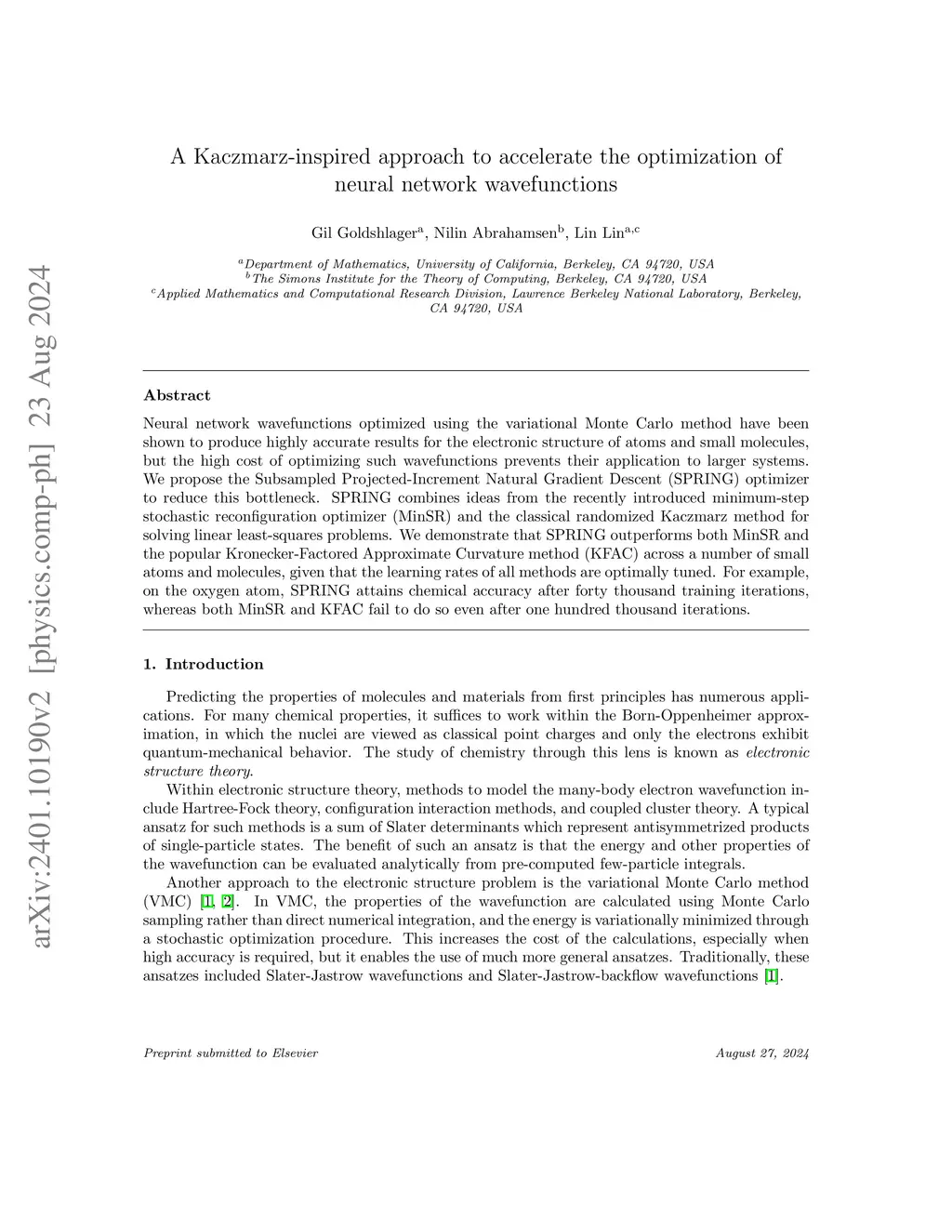 Neural network wavefunctions optimized using the variational Monte Carlo method have been shown to produce highly accurate results for the electronic structure of atoms and small molecules, but the high cost of optimizing such wavefunctions prevents their application to larger systems. We propose the Subsampled Projected-Increment Natural Gradient Descent (SPRING) optimizer to reduce this bottleneck. SPRING combines ideas from the recently introduced minimum-step stochastic reconfiguration optimizer (MinSR) and the classical randomized Kaczmarz method for solving linear least-squares problems. We demonstrate that SPRING outperforms both MinSR and the popular Kronecker-Factored Approximate Curvature method (KFAC) across a number of small atoms and molecules, given that the learning rates of all methods are optimally tuned. For example, on the oxygen atom, SPRING attains chemical accuracy after forty thousand training iterations, whereas both MinSR and KFAC fail to do so even after one hundred thousand iterations.