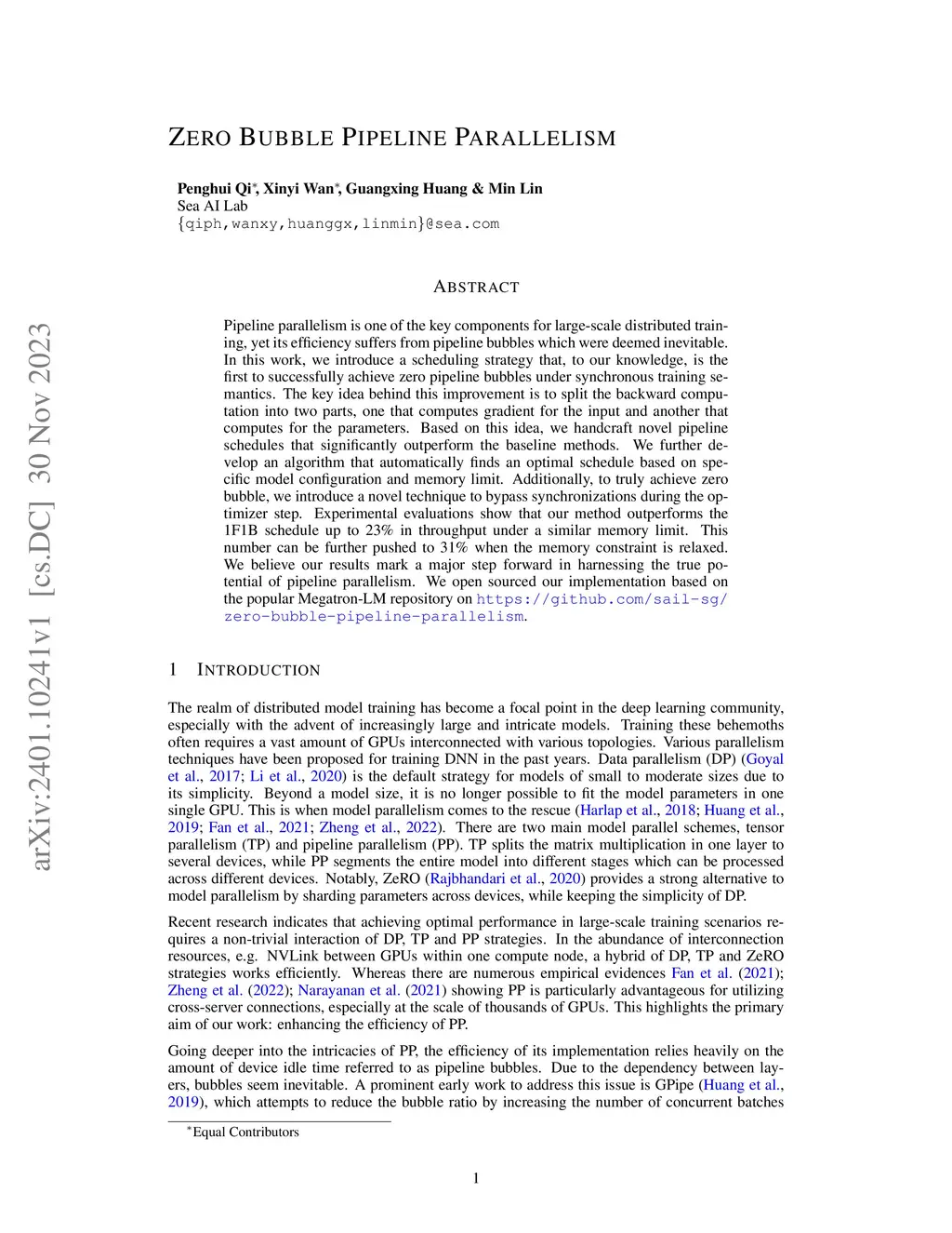 Zero Bubble Pipeline Parallelism