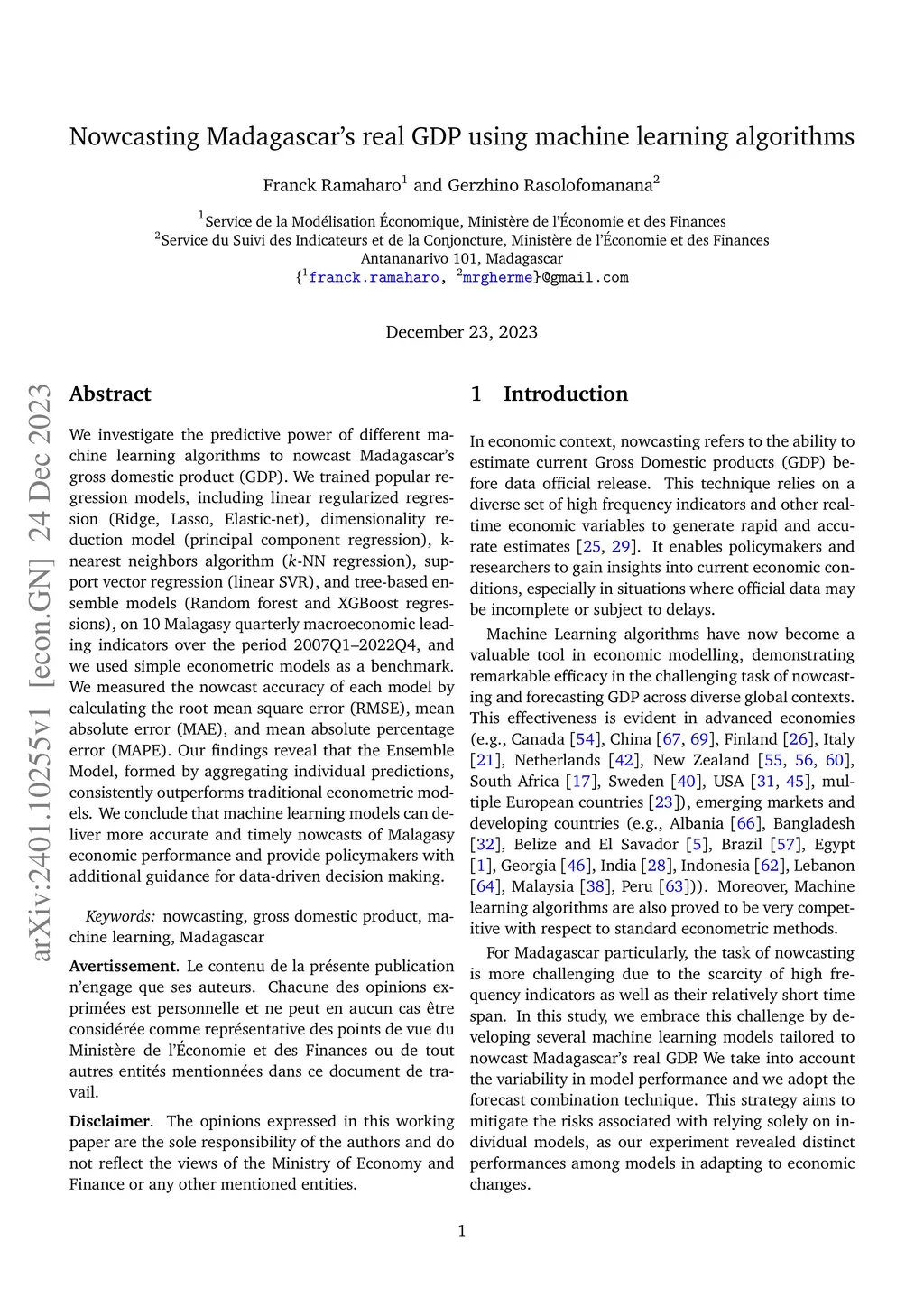 Nowcasting Madagascar's real GDP using machine learning algorithms