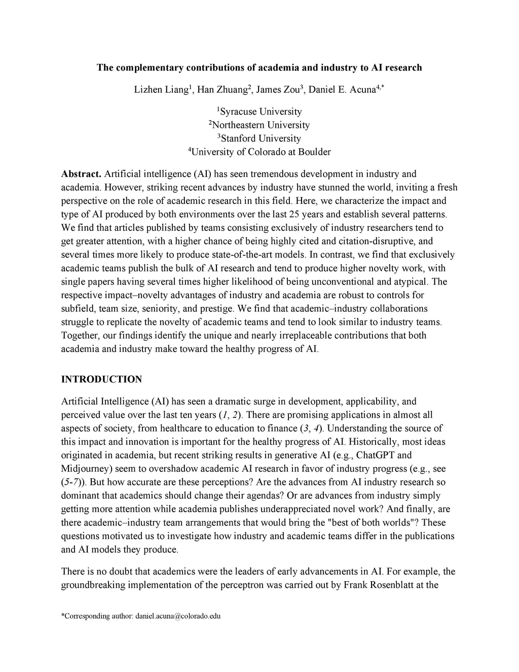 The complementary contributions of academia and industry to AI research