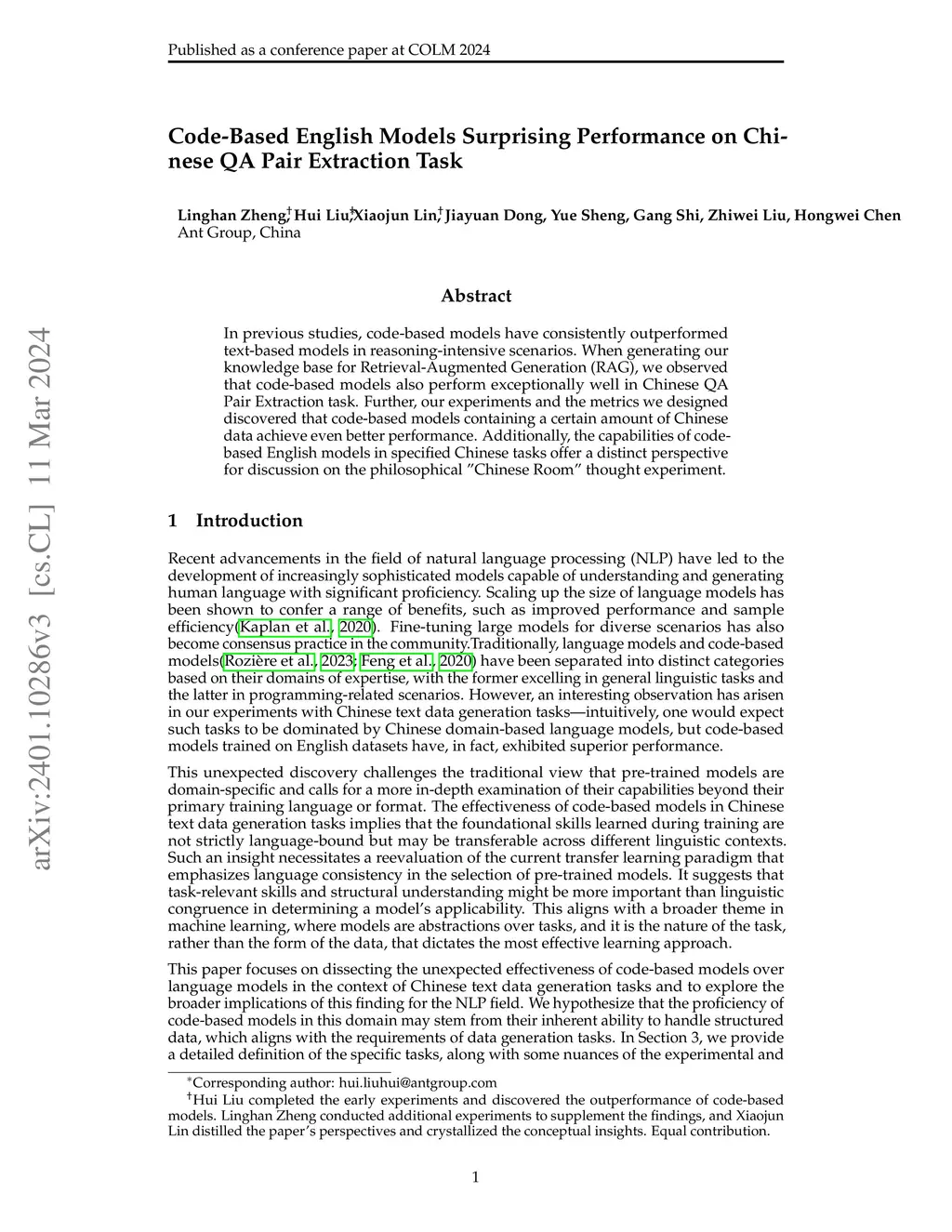 In previous studies, code-based models have consistently outperformed text-based models in reasoning-intensive scenarios. When generating our knowledge base for Retrieval-Augmented Generation (RAG), we observed that code-based models also perform exceptionally well in Chinese QA Pair Extraction task. Further, our experiments and the metrics we designed discovered that code-based models containing a certain amount of Chinese data achieve even better performance. Additionally, the capabilities of code-based English models in specified Chinese tasks offer a distinct perspective for discussion on the philosophical "Chinese Room" thought experiment.