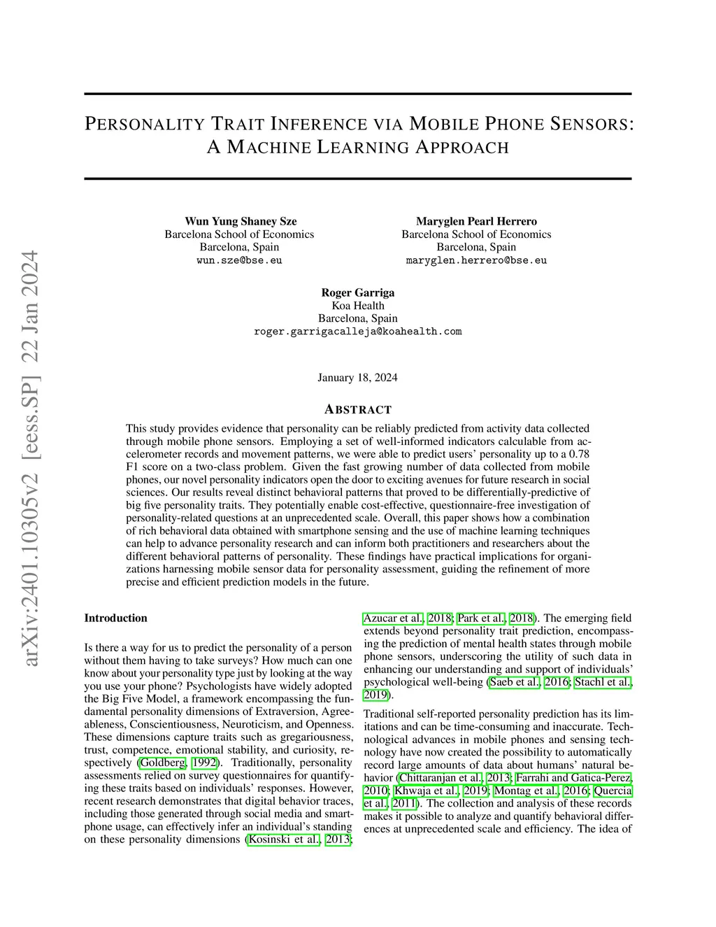 Personality Trait Inference Via Mobile Phone Sensors: A Machine Learning