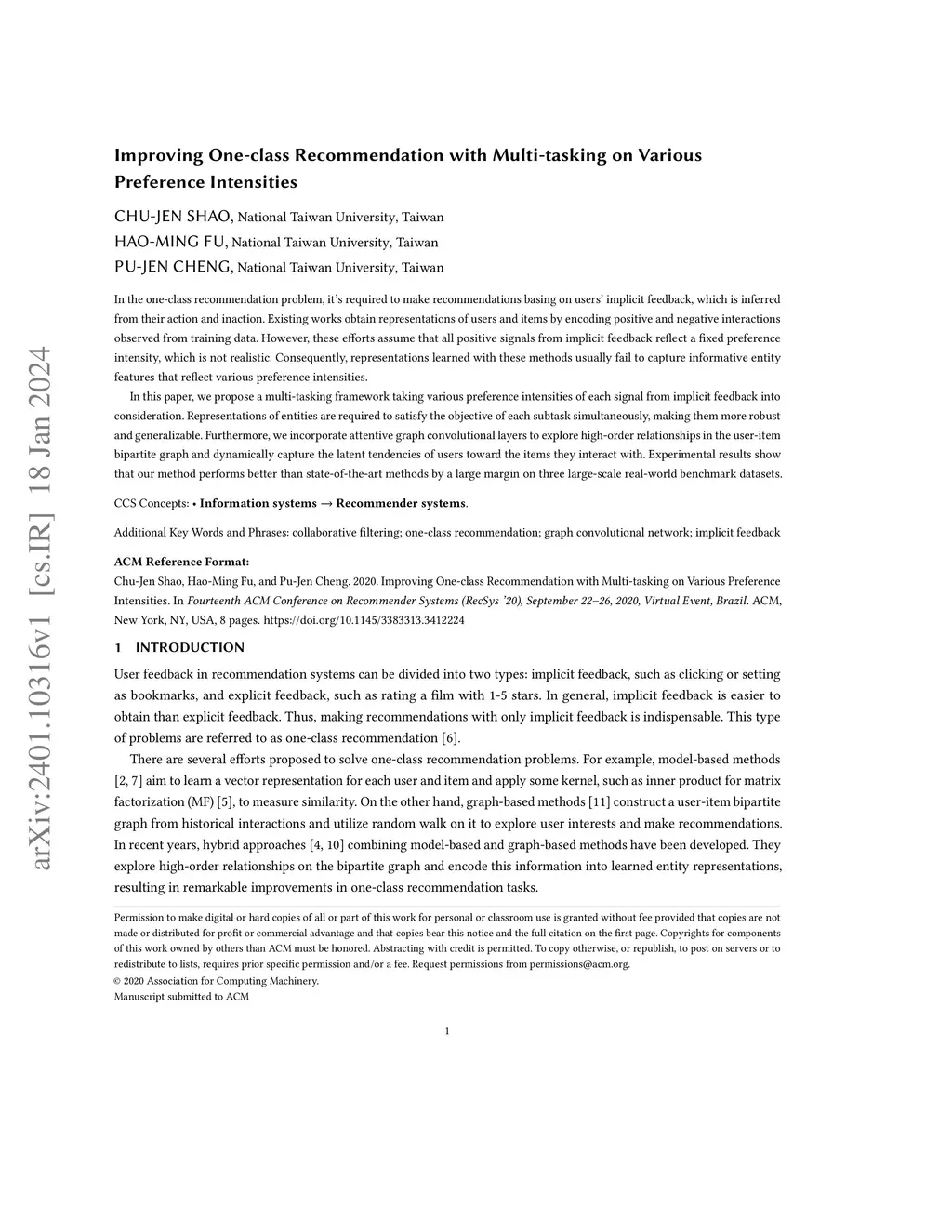 In the one-class recommendation problem, it's required to make recommendations basing on users' implicit feedback, which is inferred from their action and inaction. Existing works obtain representations of users and items by encoding positive and negative interactions observed from training data. However, these efforts assume that all positive signals from implicit feedback reflect a fixed preference intensity, which is not realistic. Consequently, representations learned with these methods usually fail to capture informative entity features that reflect various preference intensities. In this paper, we propose a multi-tasking framework taking various preference intensities of each signal from implicit feedback into consideration. Representations of entities are required to satisfy the objective of each subtask simultaneously, making them more robust and generalizable. Furthermore, we incorporate attentive graph convolutional layers to explore high-order relationships in the user-item bipartite graph and dynamically capture the latent tendencies of users toward the items they interact with. Experimental results show that our method performs better than state-of-the-art methods by a large margin on three large-scale real-world benchmark datasets.