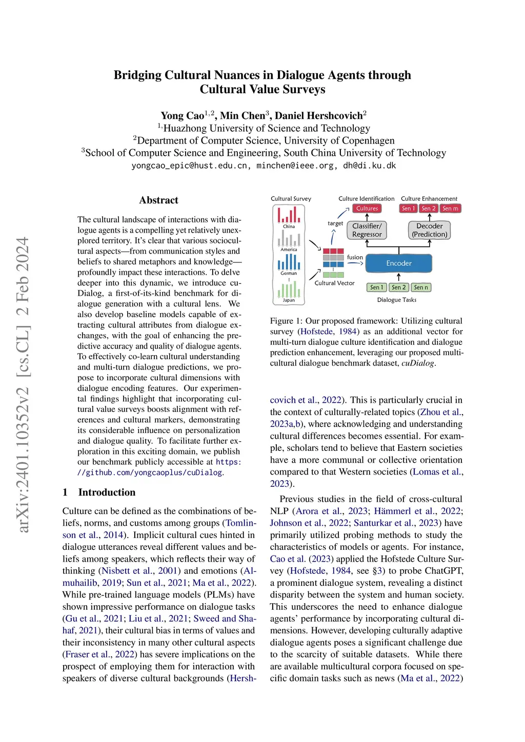 The cultural landscape of interactions with dialogue agents is a compelling yet relatively unexplored territory. It's clear that various sociocultural aspects -- from communication styles and beliefs to shared metaphors and knowledge -- profoundly impact these interactions. To delve deeper into this dynamic, we introduce cuDialog, a first-of-its-kind benchmark for dialogue generation with a cultural lens. We also develop baseline models capable of extracting cultural attributes from dialogue exchanges, with the goal of enhancing the predictive accuracy and quality of dialogue agents. To effectively co-learn cultural understanding and multi-turn dialogue predictions, we propose to incorporate cultural dimensions with dialogue encoding features. Our experimental findings highlight that incorporating cultural value surveys boosts alignment with references and cultural markers, demonstrating its considerable influence on personalization and dialogue quality. To facilitate further exploration in this exciting domain, we publish our benchmark publicly accessible at https://github.com/yongcaoplus/cuDialog.