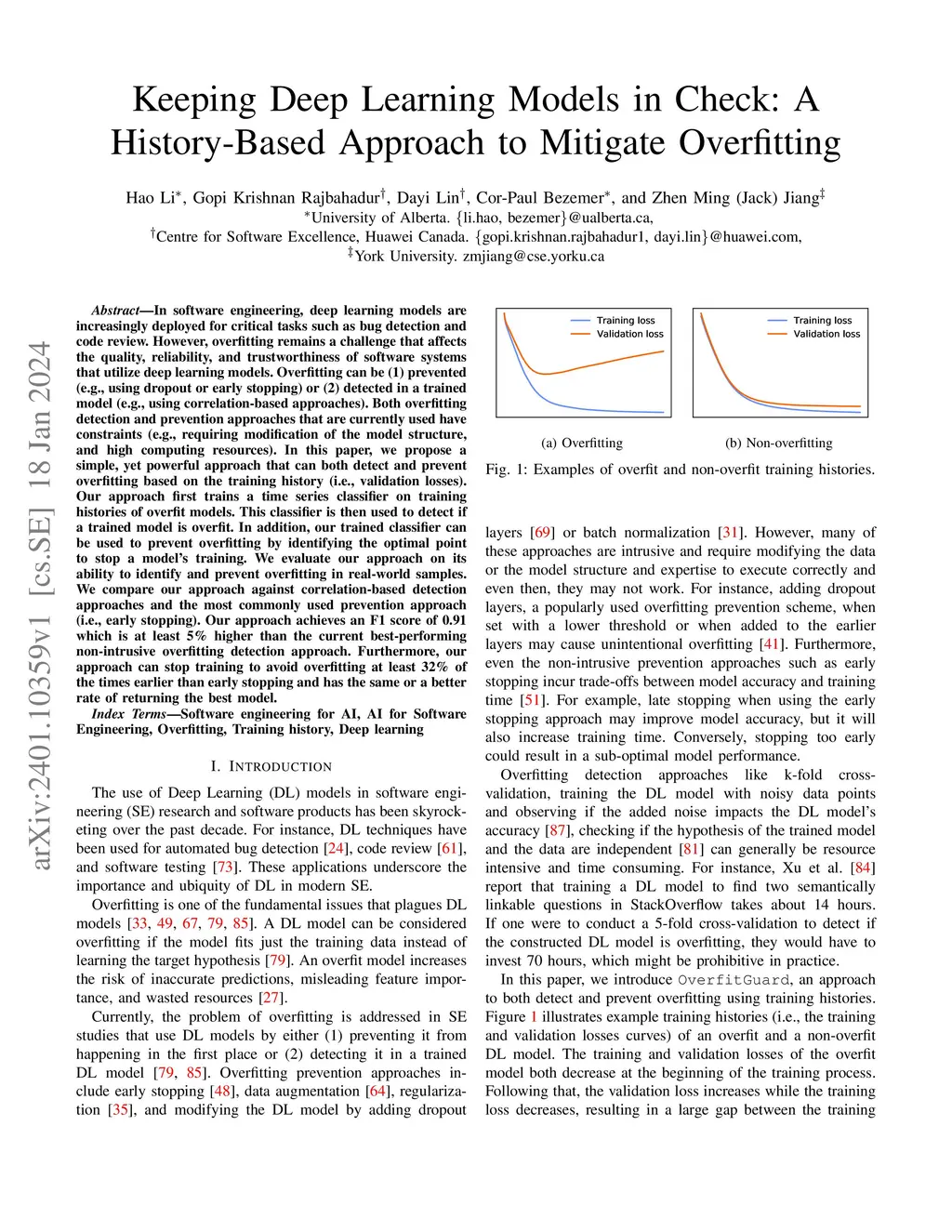 In software engineering, deep learning models are increasingly deployed for critical tasks such as bug detection and code review. However, overfitting remains a challenge that affects the quality, reliability, and trustworthiness of software systems that utilize deep learning models. Overfitting can be (1) prevented (e.g., using dropout or early stopping) or (2) detected in a trained model (e.g., using correlation-based approaches). Both overfitting detection and prevention approaches that are currently used have constraints (e.g., requiring modification of the model structure, and high computing resources). In this paper, we propose a simple, yet powerful approach that can both detect and prevent overfitting based on the training history (i.e., validation losses). Our approach first trains a time series classifier on training histories of overfit models. This classifier is then used to detect if a trained model is overfit. In addition, our trained classifier can be used to prevent overfitting by identifying the optimal point to stop a model's training. We evaluate our approach on its ability to identify and prevent overfitting in real-world samples. We compare our approach against correlation-based detection approaches and the most commonly used prevention approach (i.e., early stopping). Our approach achieves an F1 score of 0.91 which is at least 5% higher than the current best-performing non-intrusive overfitting detection approach. Furthermore, our approach can stop training to avoid overfitting at least 32% of the times earlier than early stopping and has the same or a better rate of returning the best model.