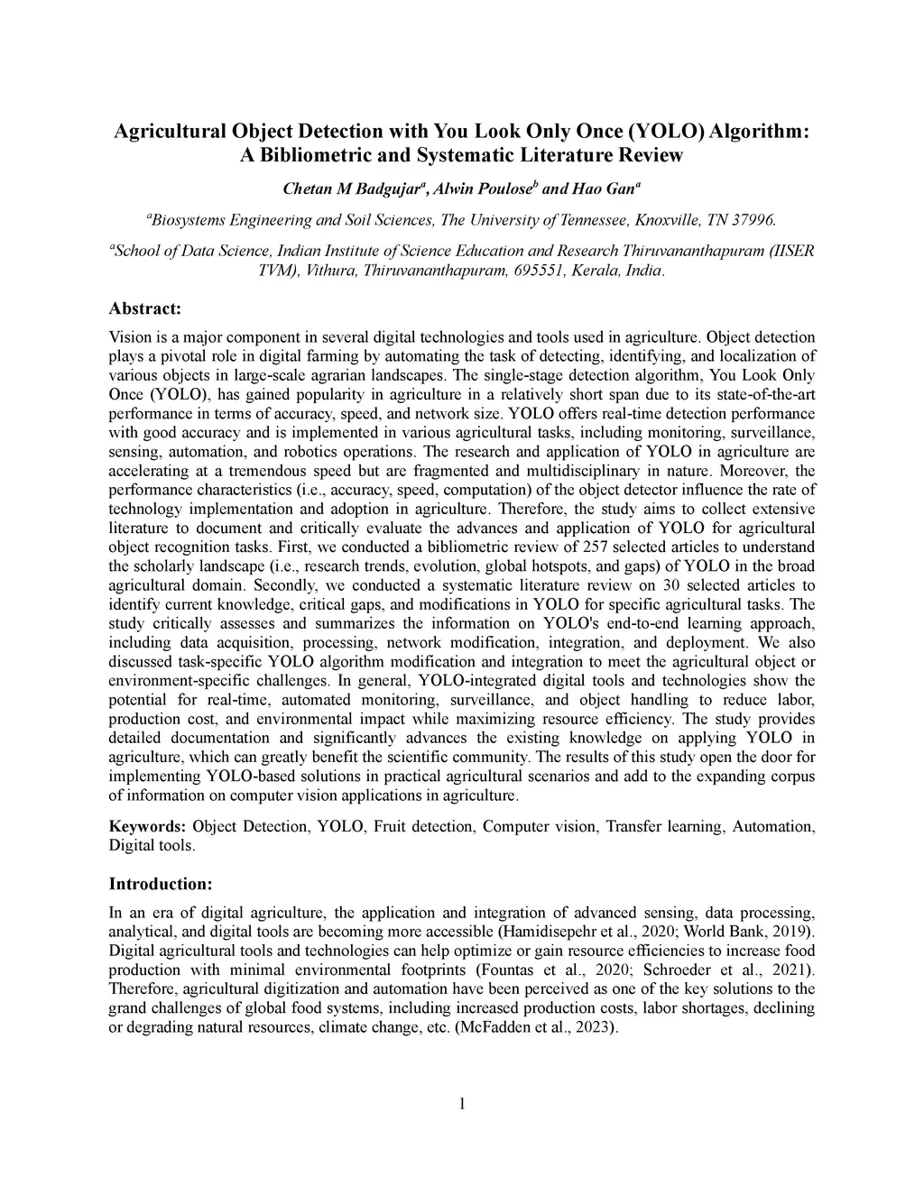 Vision is a major component in several digital technologies and tools used in agriculture. The object detector, You Look Only Once (YOLO), has gained popularity in agriculture in a relatively short span due to its state-of-the-art performance. YOLO offers real-time detection with good accuracy and is implemented in various agricultural tasks, including monitoring, surveillance, sensing, automation, and robotics. The research and application of YOLO in agriculture are accelerating rapidly but are fragmented and multidisciplinary. Moreover, the performance characteristics (i.e., accuracy, speed, computation) of the object detector influence the rate of technology implementation and adoption in agriculture. Thus, the study aims to collect extensive literature to document and critically evaluate the advances and application of YOLO for agricultural object recognition. First, we conducted a bibliometric review of 257 articles to understand the scholarly landscape of YOLO in agricultural domain. Secondly, we conducted a systematic review of 30 articles to identify current knowledge, gaps, and modifications in YOLO for specific agricultural tasks. The study critically assesses and summarizes the information on YOLO's end-to-end learning approach, including data acquisition, processing, network modification, integration, and deployment. We also discussed task-specific YOLO algorithm modification and integration to meet the agricultural object or environment-specific challenges. In general, YOLO-integrated digital tools and technologies show the potential for real-time, automated monitoring, surveillance, and object handling to reduce labor, production cost, and environmental impact while maximizing resource efficiency. The study provides detailed documentation and significantly advances the existing knowledge on applying YOLO in agriculture, which can greatly benefit the scientific community.