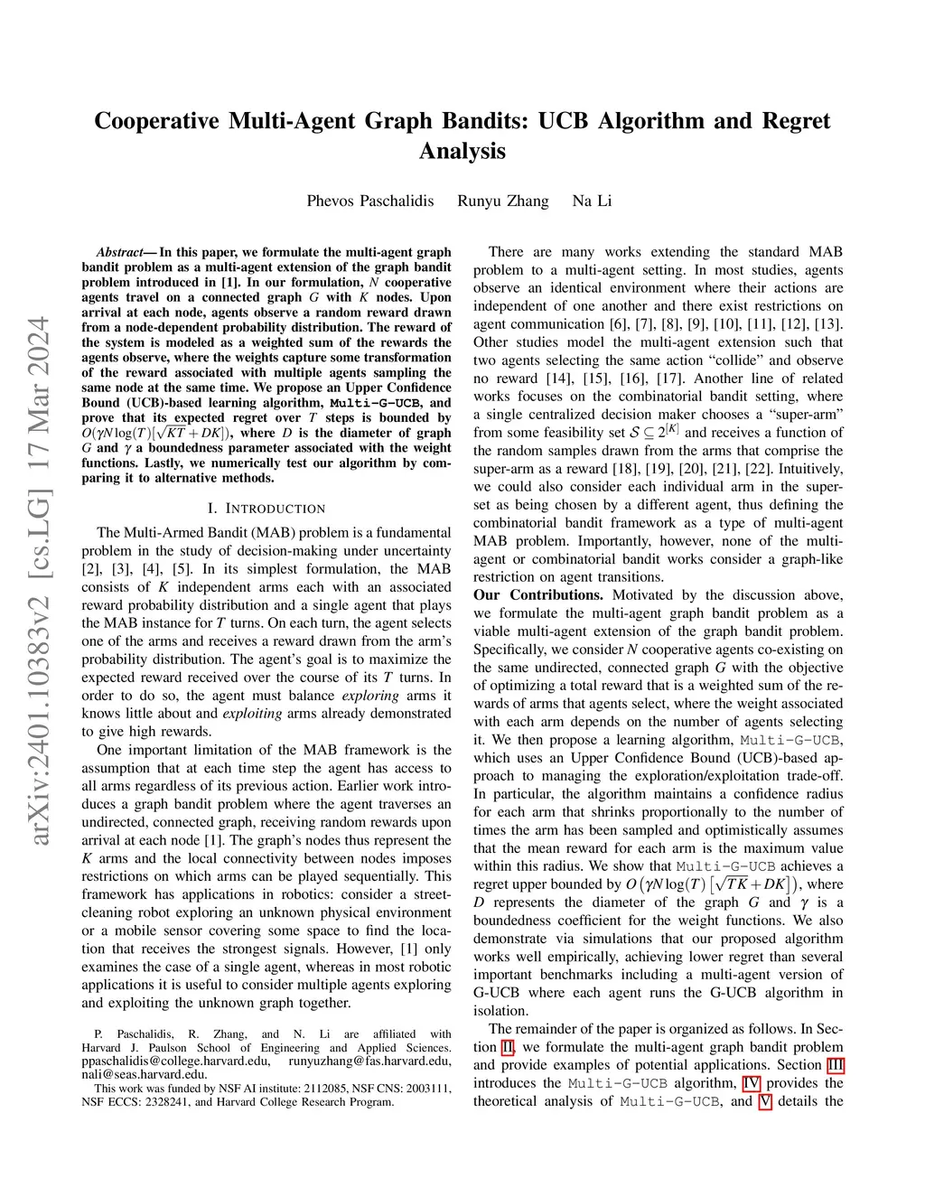 Cooperative Multi-Agent Graph Bandits: UCB Algorithm and Regret Analysis