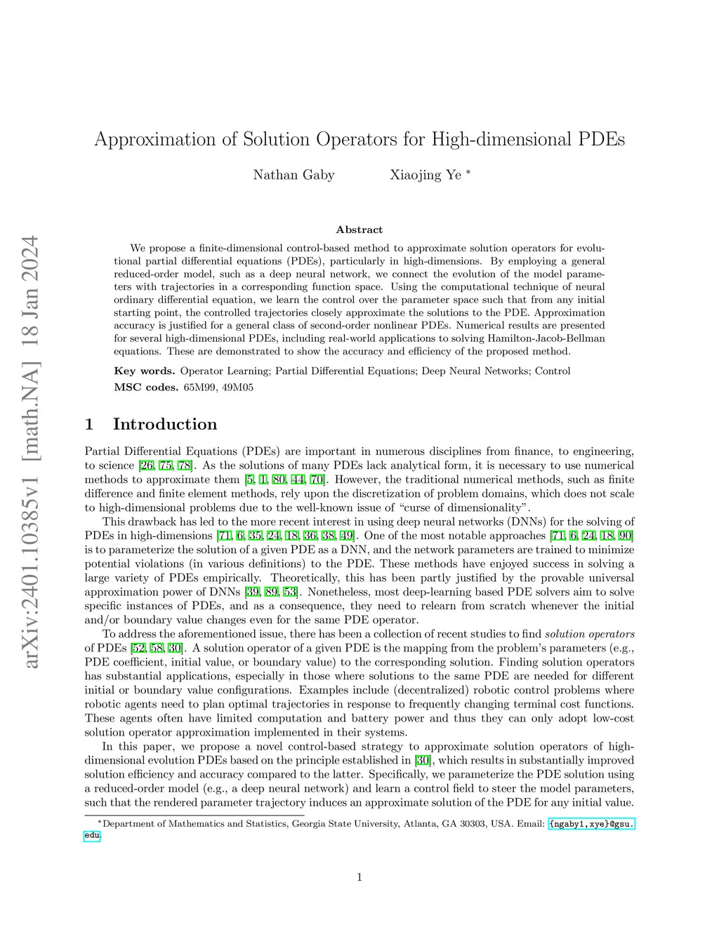 We propose a finite-dimensional control-based method to approximate solution operators for evolutional partial differential equations (PDEs), particularly in high-dimensions. By employing a general reduced-order model, such as a deep neural network, we connect the evolution of the model parameters with trajectories in a corresponding function space. Using the computational technique of neural ordinary differential equation, we learn the control over the parameter space such that from any initial starting point, the controlled trajectories closely approximate the solutions to the PDE. Approximation accuracy is justified for a general class of second-order nonlinear PDEs. Numerical results are presented for several high-dimensional PDEs, including real-world applications to solving Hamilton-Jacobi-Bellman equations. These are demonstrated to show the accuracy and efficiency of the proposed method.