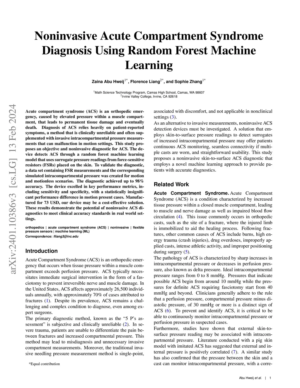 Acute compartment syndrome (ACS) is an orthopedic emergency, caused by elevated pressure within a muscle compartment, that leads to permanent tissue damage and eventually death. Diagnosis of ACS relies heavily on patient-reported symptoms, a method that is clinically unreliable and often supplemented with invasive intracompartmental pressure measurements that can malfunction in motion settings. This study proposes an objective and noninvasive diagnostic for ACS. The device detects ACS through a random forest machine learning model that uses surrogate pressure readings from force-sensitive resistors (FSRs) placed on the skin. To validate the diagnostic, a data set containing FSR measurements and the corresponding simulated intracompartmental pressure was created for motion and motionless scenarios. The diagnostic achieved up to 98% accuracy. The device excelled in key performance metrics, including sensitivity and specificity, with a statistically insignificant performance difference in motion present cases. Manufactured for 73 USD, our device may be a cost-effective solution. These results demonstrate the potential of noninvasive ACS diagnostics to meet clinical accuracy standards in real world settings.