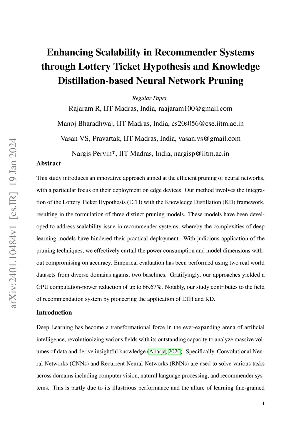 This study introduces an innovative approach aimed at the efficient pruning of neural networks, with a particular focus on their deployment on edge devices. Our method involves the integration of the Lottery Ticket Hypothesis (LTH) with the Knowledge Distillation (KD) framework, resulting in the formulation of three distinct pruning models. These models have been developed to address scalability issue in recommender systems, whereby the complexities of deep learning models have hindered their practical deployment. With judicious application of the pruning techniques, we effectively curtail the power consumption and model dimensions without compromising on accuracy. Empirical evaluation has been performed using two real world datasets from diverse domains against two baselines. Gratifyingly, our approaches yielded a GPU computation-power reduction of up to 66.67%. Notably, our study contributes to the field of recommendation system by pioneering the application of LTH and KD.