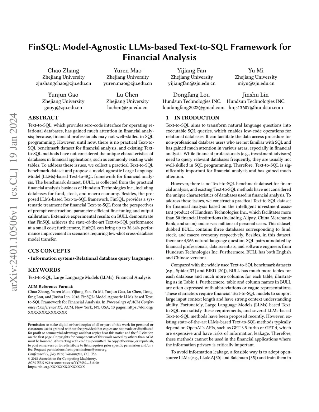 Text-to-SQL, which provides zero-code interface for operating relational databases, has gained much attention in financial analysis; because, financial professionals may not well-skilled in SQL programming. However, until now, there is no practical Text-to-SQL benchmark dataset for financial analysis, and existing Text-to-SQL methods have not considered the unique characteristics of databases in financial applications, such as commonly existing wide tables. To address these issues, we collect a practical Text-to-SQL benchmark dataset and propose a model-agnostic Large Language Model (LLMs)-based Text-to-SQL framework for financial analysis. The benchmark dataset, BULL, is collected from the practical financial analysis business of Hundsun Technologies Inc., including databases for fund, stock, and macro economy. Besides, the proposed LLMs-based Text-to-SQL framework, FinSQL, provides a systematic treatment for financial Text-to-SQL from the perspectives of prompt construction, parameter-efficient fine-tuning and output calibration. Extensive experimental results on BULL demonstrate that FinSQL achieves the state-of-the-art Text-to-SQL performance at a small cost; furthermore, FinSQL can bring up to 36.64% performance improvement in scenarios requiring few-shot cross-database model transfer.