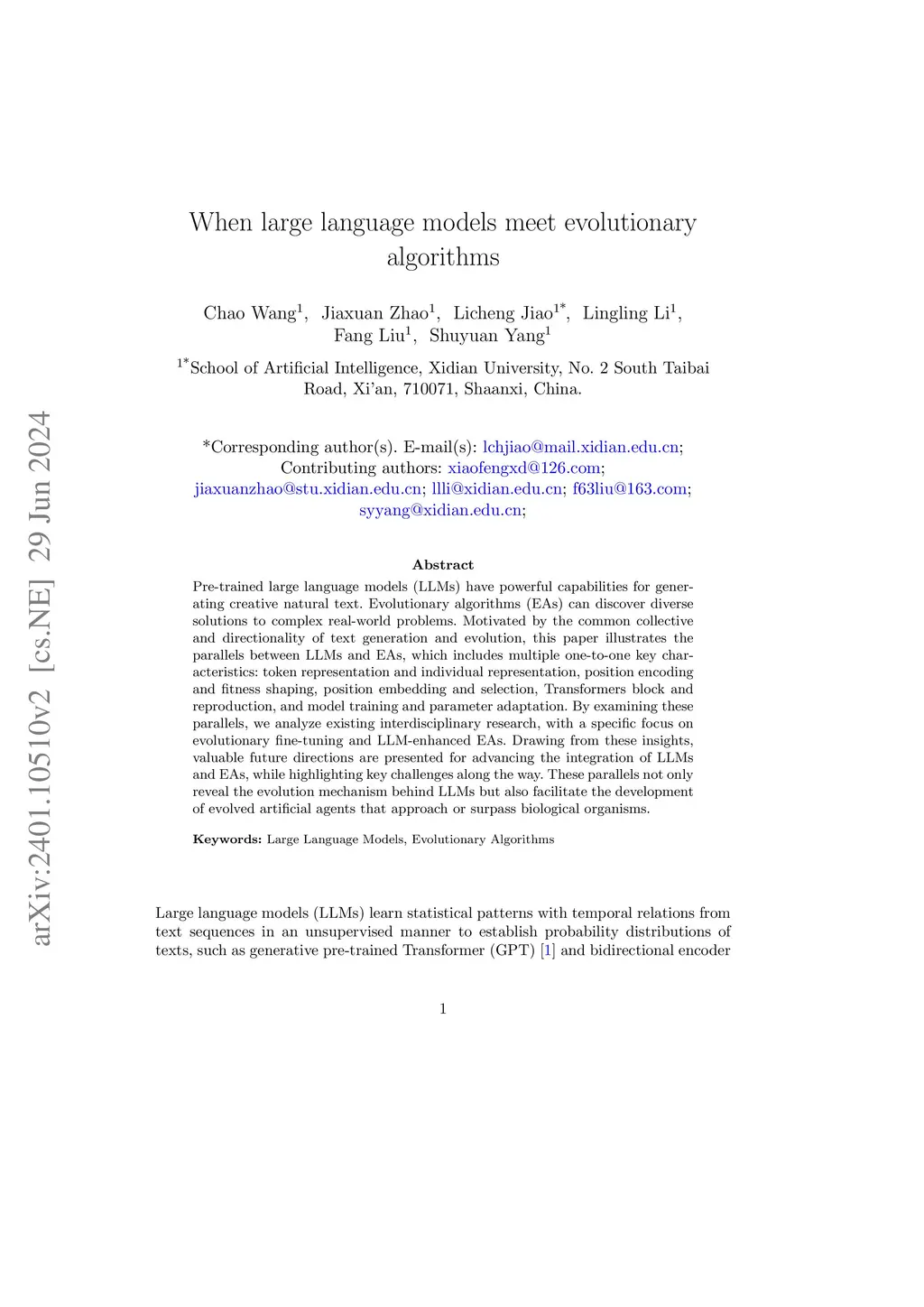Pre-trained large language models (LLMs) exhibit powerful capabilities for generating natural text. Evolutionary algorithms (EAs) can discover diverse solutions to complex real-world problems. Motivated by the common collective and directionality of text generation and evolution, this paper first illustrates the conceptual parallels between LLMs and EAs at a micro level, which includes multiple one-to-one key characteristics: token representation and individual representation, position encoding and fitness shaping, position embedding and selection, Transformers block and reproduction, and model training and parameter adaptation. These parallels highlight potential opportunities for technical advancements in both LLMs and EAs. Subsequently, we analyze existing interdisciplinary research from a macro perspective to uncover critical challenges, with a particular focus on evolutionary fine-tuning and LLM-enhanced EAs. These analyses not only provide insights into the evolutionary mechanisms behind LLMs but also offer potential directions for enhancing the capabilities of artificial agents.
