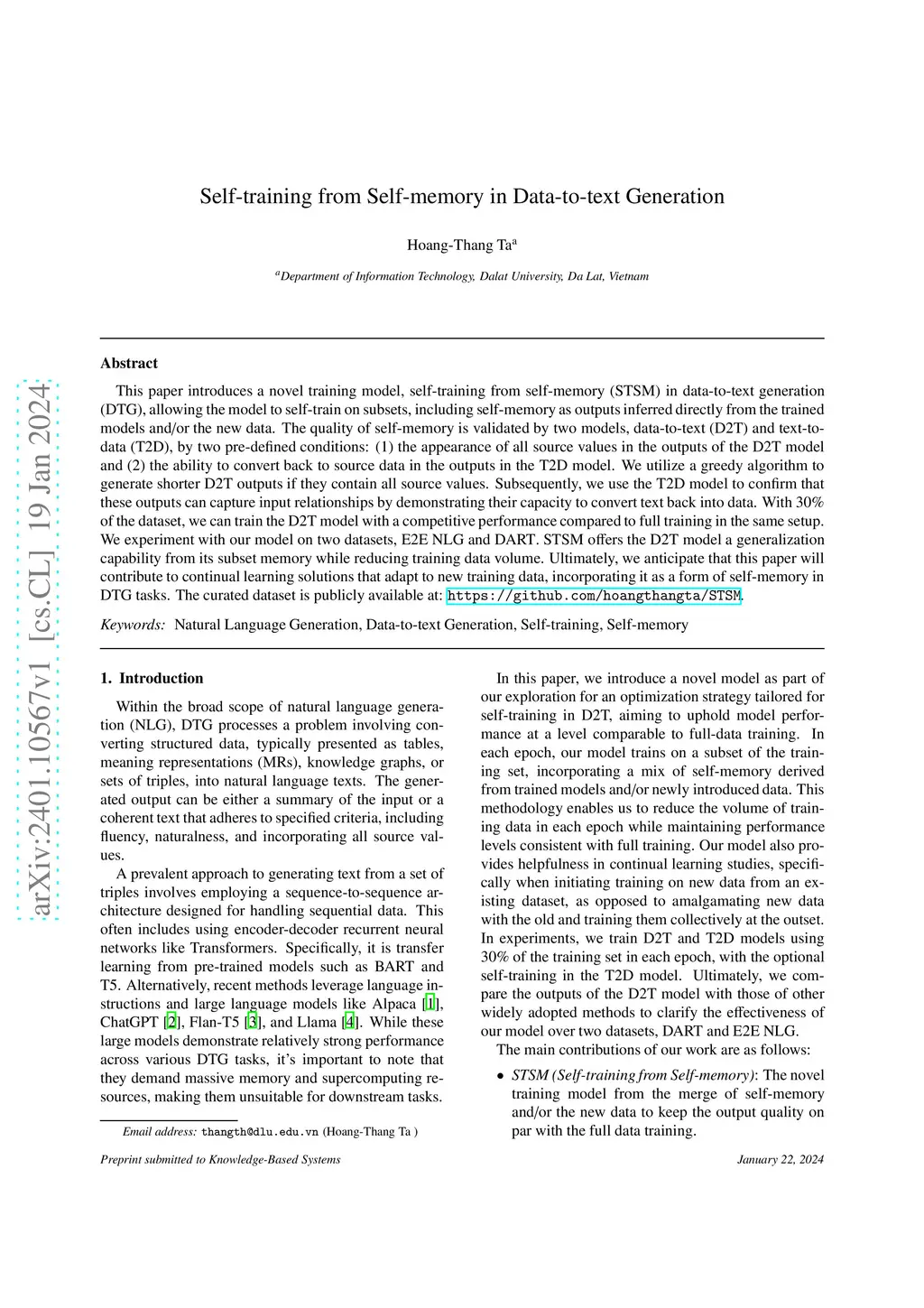 This paper introduces a novel training model, self-training from self-memory (STSM) in data-to-text generation (DTG), allowing the model to self-train on subsets, including self-memory as outputs inferred directly from the trained models and/or the new data. The quality of self-memory is validated by two models, data-to-text (D2T) and text-to-data (T2D), by two pre-defined conditions: (1) the appearance of all source values in the outputs of the D2T model and (2) the ability to convert back to source data in the outputs in the T2D model. We utilize a greedy algorithm to generate shorter D2T outputs if they contain all source values. Subsequently, we use the T2D model to confirm that these outputs can capture input relationships by demonstrating their capacity to convert text back into data. With 30% of the dataset, we can train the D2T model with a competitive performance compared to full training in the same setup. We experiment with our model on two datasets, E2E NLG and DART. STSM offers the D2T model a generalization capability from its subset memory while reducing training data volume. Ultimately, we anticipate that this paper will contribute to continual learning solutions that adapt to new training data, incorporating it as a form of self-memory in DTG tasks. The curated dataset is publicly available at: https://github.com/hoangthangta/STSM.