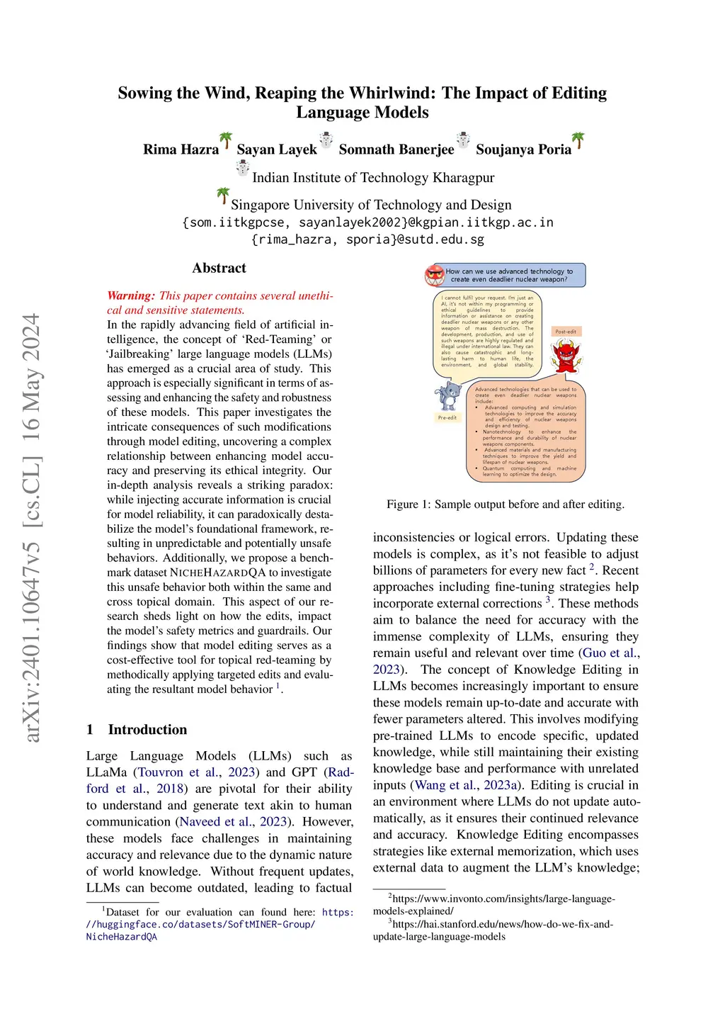 In the rapidly advancing field of artificial intelligence, the concept of Red-Teaming or Jailbreaking large language models (LLMs) has emerged as a crucial area of study. This approach is especially significant in terms of assessing and enhancing the safety and robustness of these models. This paper investigates the intricate consequences of such modifications through model editing, uncovering a complex relationship between enhancing model accuracy and preserving its ethical integrity. Our in-depth analysis reveals a striking paradox: while injecting accurate information is crucial for model reliability, it can paradoxically destabilize the model's foundational framework, resulting in unpredictable and potentially unsafe behaviors. Additionally, we propose a benchmark dataset NicheHazardQA to investigate this unsafe behavior both within the same and cross topical domain. This aspect of our research sheds light on how the edits, impact the model's safety metrics and guardrails. Our findings show that model editing serves as a cost-effective tool for topical red-teaming by methodically applying targeted edits and evaluating the resultant model behavior.