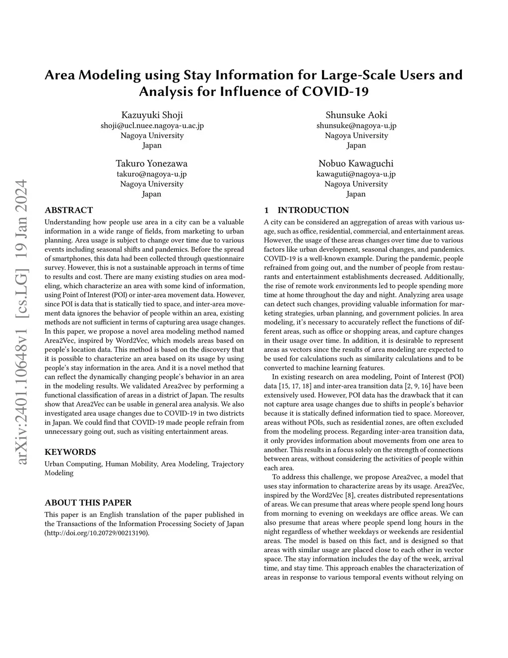 Understanding how people use area in a city can be a valuable information in a wide range of fields, from marketing to urban planning. Area usage is subject to change over time due to various events including seasonal shifts and pandemics. Before the spread of smartphones, this data had been collected through questionnaire survey. However, this is not a sustainable approach in terms of time to results and cost. There are many existing studies on area modeling, which characterize an area with some kind of information, using Point of Interest (POI) or inter-area movement data. However, since POI is data that is statically tied to space, and inter-area movement data ignores the behavior of people within an area, existing methods are not sufficient in terms of capturing area usage changes. In this paper, we propose a novel area modeling method named Area2Vec, inspired by Word2Vec, which models areas based on people's location data. This method is based on the discovery that it is possible to characterize an area based on its usage by using people's stay information in the area. And it is a novel method that can reflect the dynamically changing people's behavior in an area in the modeling results. We validated Area2vec by performing a functional classification of areas in a district of Japan. The results show that Area2Vec can be usable in general area analysis. We also investigated area usage changes due to COVID-19 in two districts in Japan. We could find that COVID-19 made people refrain from unnecessary going out, such as visiting entertainment areas.