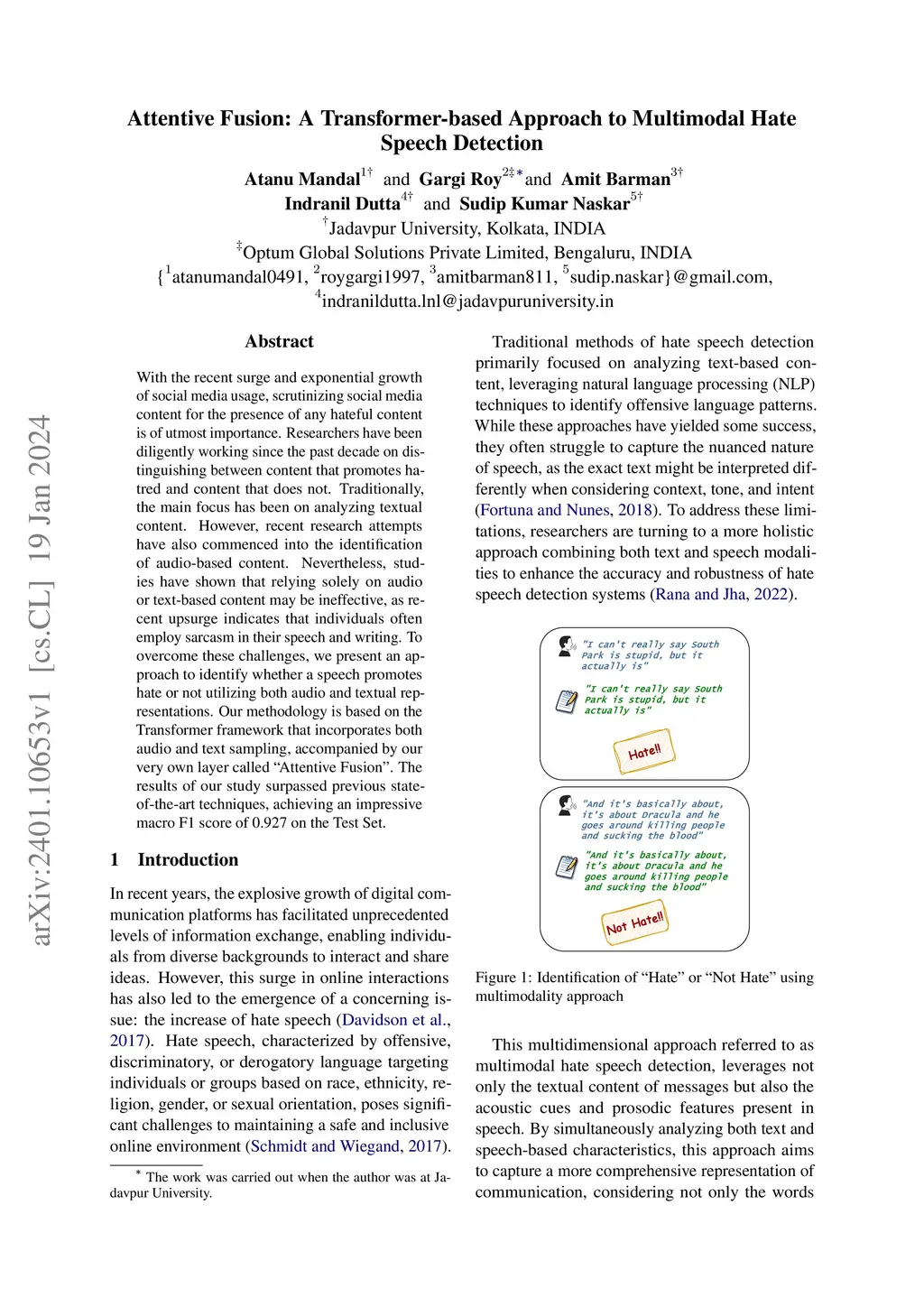 With the recent surge and exponential growth of social media usage, scrutinizing social media content for the presence of any hateful content is of utmost importance. Researchers have been diligently working since the past decade on distinguishing between content that promotes hatred and content that does not. Traditionally, the main focus has been on analyzing textual content. However, recent research attempts have also commenced into the identification of audio-based content. Nevertheless, studies have shown that relying solely on audio or text-based content may be ineffective, as recent upsurge indicates that individuals often employ sarcasm in their speech and writing. To overcome these challenges, we present an approach to identify whether a speech promotes hate or not utilizing both audio and textual representations. Our methodology is based on the Transformer framework that incorporates both audio and text sampling, accompanied by our very own layer called "Attentive Fusion". The results of our study surpassed previous state-of-the-art techniques, achieving an impressive macro F1 score of 0.927 on the Test Set.