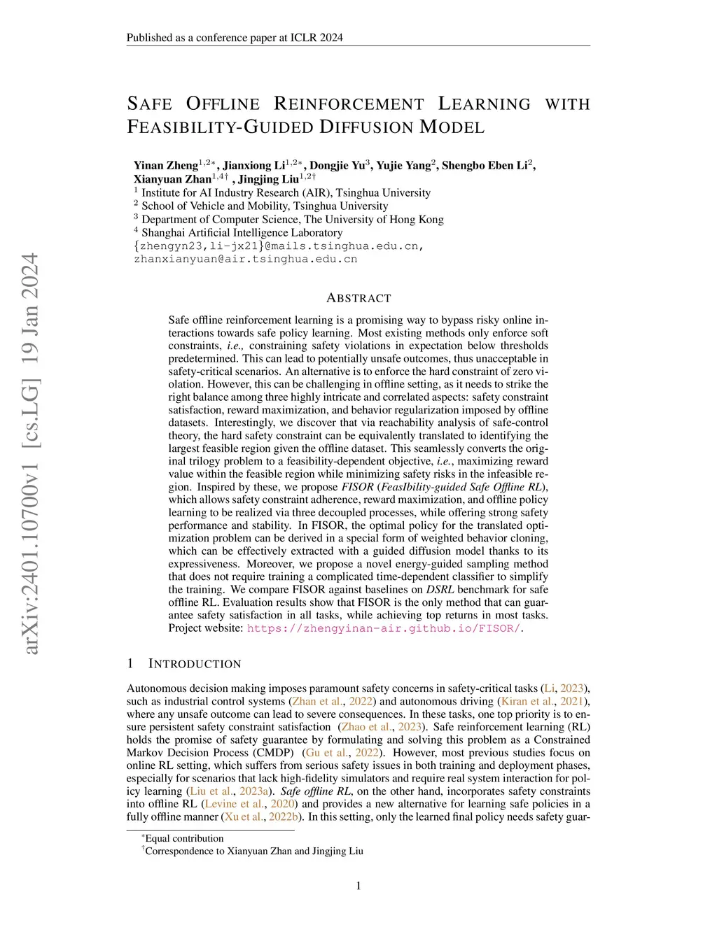 Safe offline RL is a promising way to bypass risky online interactions towards safe policy learning. Most existing methods only enforce soft constraints, i.e., constraining safety violations in expectation below thresholds predetermined. This can lead to potentially unsafe outcomes, thus unacceptable in safety-critical scenarios. An alternative is to enforce the hard constraint of zero violation. However, this can be challenging in offline setting, as it needs to strike the right balance among three highly intricate and correlated aspects: safety constraint satisfaction, reward maximization, and behavior regularization imposed by offline datasets. Interestingly, we discover that via reachability analysis of safe-control theory, the hard safety constraint can be equivalently translated to identifying the largest feasible region given the offline dataset. This seamlessly converts the original trilogy problem to a feasibility-dependent objective, i.e., maximizing reward value within the feasible region while minimizing safety risks in the infeasible region. Inspired by these, we propose FISOR (FeasIbility-guided Safe Offline RL), which allows safety constraint adherence, reward maximization, and offline policy learning to be realized via three decoupled processes, while offering strong safety performance and stability. In FISOR, the optimal policy for the translated optimization problem can be derived in a special form of weighted behavior cloning. Thus, we propose a novel energy-guided diffusion model that does not require training a complicated time-dependent classifier to extract the policy, greatly simplifying the training. We compare FISOR against baselines on DSRL benchmark for safe offline RL. Evaluation results show that FISOR is the only method that can guarantee safety satisfaction in all tasks, while achieving top returns in most tasks.