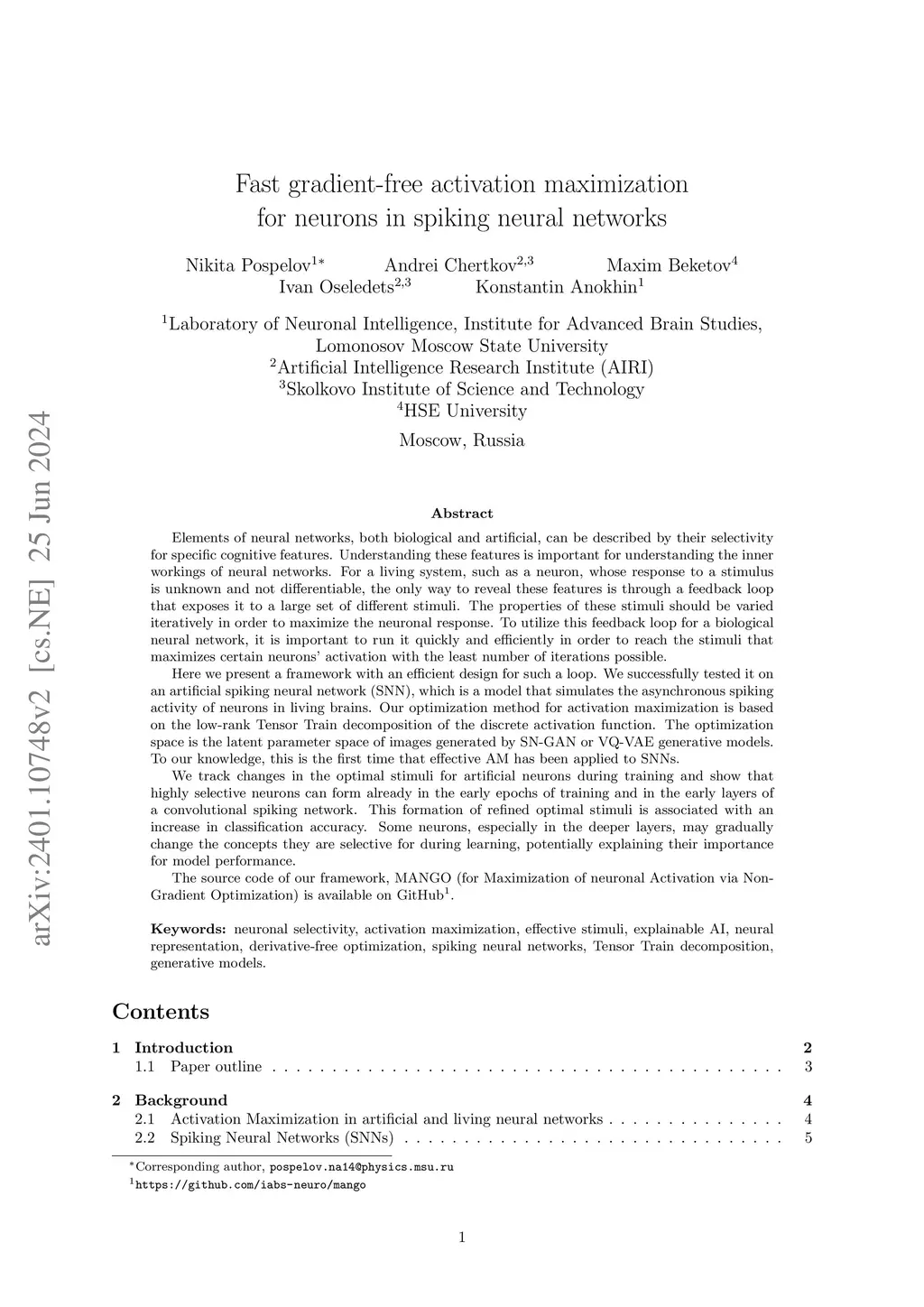 Elements of neural networks, both biological and artificial, can be described by their selectivity for specific cognitive features. Understanding these features is important for understanding the inner workings of neural networks. For a living system, such as a neuron, whose response to a stimulus is unknown and not differentiable, the only way to reveal these features is through a feedback loop that exposes it to a large set of different stimuli. The properties of these stimuli should be varied iteratively in order to maximize the neuronal response. To utilize this feedback loop for a biological neural network, it is important to run it quickly and efficiently in order to reach the stimuli that maximizes certain neurons' activation with the least number of iterations possible. Here we present a framework with an efficient design for such a loop. We successfully tested it on an artificial spiking neural network (SNN), which is a model that simulates the asynchronous spiking activity of neurons in living brains. Our optimization method for activation maximization is based on the low-rank Tensor Train decomposition of the discrete activation function. The optimization space is the latent parameter space of images generated by SN-GAN or VQ-VAE generative models. To our knowledge, this is the first time that effective AM has been applied to SNNs. We track changes in the optimal stimuli for artificial neurons during training and show that highly selective neurons can form already in the early epochs of training and in the early layers of a convolutional spiking network. This formation of refined optimal stimuli is associated with an increase in classification accuracy. Some neurons, especially in the deeper layers, may gradually change the concepts they are selective for during learning, potentially explaining their importance for model performance.