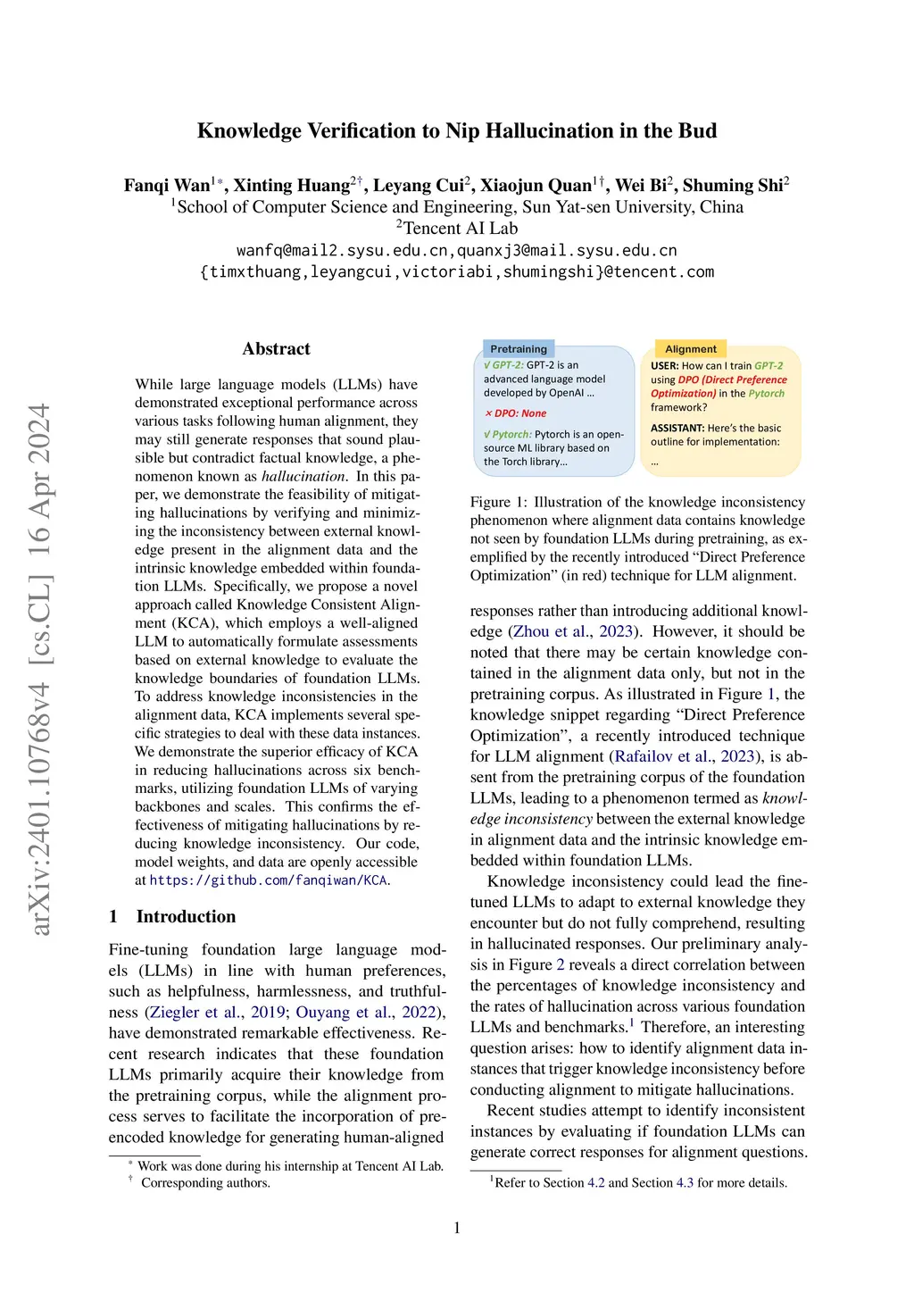 While large language models (LLMs) have demonstrated exceptional performance across various tasks following human alignment, they may still generate responses that sound plausible but contradict factual knowledge, a phenomenon known as \emph{hallucination}. In this paper, we demonstrate the feasibility of mitigating hallucinations by verifying and minimizing the inconsistency between external knowledge present in the alignment data and the intrinsic knowledge embedded within foundation LLMs. Specifically, we propose a novel approach called Knowledge Consistent Alignment (KCA), which employs a well-aligned LLM to automatically formulate assessments based on external knowledge to evaluate the knowledge boundaries of foundation LLMs. To address knowledge inconsistencies in the alignment data, KCA implements several specific strategies to deal with these data instances. We demonstrate the superior efficacy of KCA in reducing hallucinations across six benchmarks, utilizing foundation LLMs of varying backbones and scales. This confirms the effectiveness of mitigating hallucinations by reducing knowledge inconsistency. Our code, model weights, and data are openly accessible at \url{https://github.com/fanqiwan/KCA}.