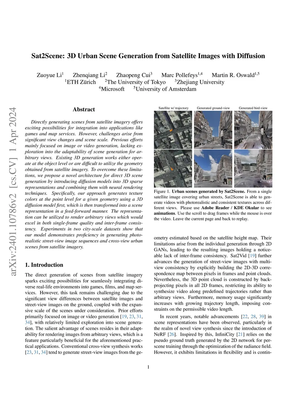 Directly generating scenes from satellite imagery offers exciting possibilities for integration into applications like games and map services. However, challenges arise from significant view changes and scene scale. Previous efforts mainly focused on image or video generation, lacking exploration into the adaptability of scene generation for arbitrary views. Existing 3D generation works either operate at the object level or are difficult to utilize the geometry obtained from satellite imagery. To overcome these limitations, we propose a novel architecture for direct 3D scene generation by introducing diffusion models into 3D sparse representations and combining them with neural rendering techniques. Specifically, our approach generates texture colors at the point level for a given geometry using a 3D diffusion model first, which is then transformed into a scene representation in a feed-forward manner. The representation can be utilized to render arbitrary views which would excel in both single-frame quality and inter-frame consistency. Experiments in two city-scale datasets show that our model demonstrates proficiency in generating photo-realistic street-view image sequences and cross-view urban scenes from satellite imagery.
