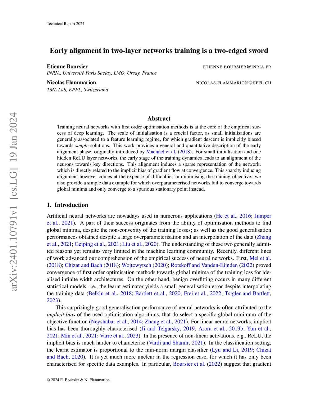 Training neural networks with first order optimisation methods is at the core of the empirical success of deep learning. The scale of initialisation is a crucial factor, as small initialisations are generally associated to a feature learning regime, for which gradient descent is implicitly biased towards simple solutions. This work provides a general and quantitative description of the early alignment phase, originally introduced by Maennel et al. (2018). For small initialisation and one hidden ReLU layer networks, the early stage of the training dynamics leads to an alignment of the neurons towards key directions. This alignment induces a sparse representation of the network, which is directly related to the implicit bias of gradient flow at convergence. This sparsity inducing alignment however comes at the expense of difficulties in minimising the training objective: we also provide a simple data example for which overparameterised networks fail to converge towards global minima and only converge to a spurious stationary point instead.