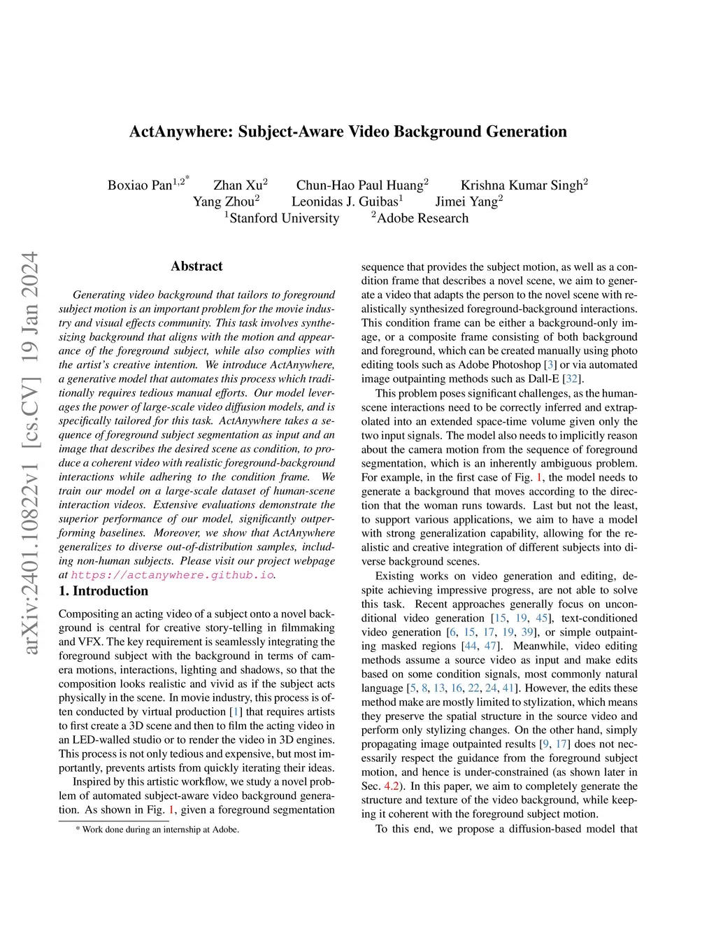 Generating video background that tailors to foreground subject motion is an important problem for the movie industry and visual effects community. This task involves synthesizing background that aligns with the motion and appearance of the foreground subject, while also complies with the artist's creative intention. We introduce ActAnywhere, a generative model that automates this process which traditionally requires tedious manual efforts. Our model leverages the power of large-scale video diffusion models, and is specifically tailored for this task. ActAnywhere takes a sequence of foreground subject segmentation as input and an image that describes the desired scene as condition, to produce a coherent video with realistic foreground-background interactions while adhering to the condition frame. We train our model on a large-scale dataset of human-scene interaction videos. Extensive evaluations demonstrate the superior performance of our model, significantly outperforming baselines. Moreover, we show that ActAnywhere generalizes to diverse out-of-distribution samples, including non-human subjects. Please visit our project webpage at https://actanywhere.github.io.