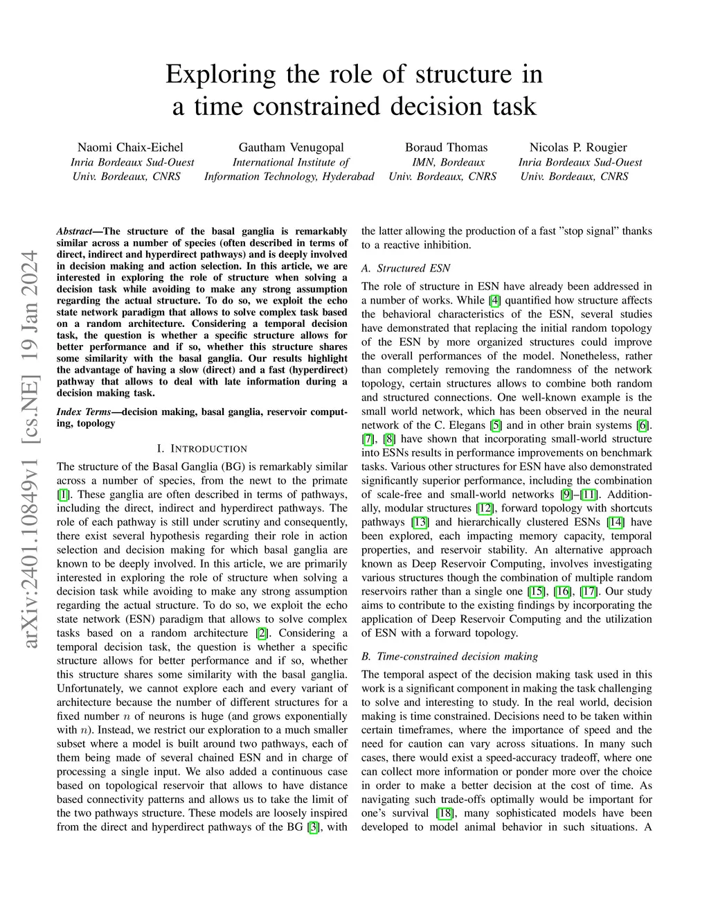 The structure of the basal ganglia is remarkably similar across a number of species (often described in terms of direct, indirect and hyperdirect pathways) and is deeply involved in decision making and action selection. In this article, we are interested in exploring the role of structure when solving a decision task while avoiding to make any strong assumption regarding the actual structure. To do so, we exploit the echo state network paradigm that allows to solve complex task based on a random architecture. Considering a temporal decision task, the question is whether a specific structure allows for better performance and if so, whether this structure shares some similarity with the basal ganglia. Our results highlight the advantage of having a slow (direct) and a fast (hyperdirect) pathway that allows to deal with late information during a decision making task.