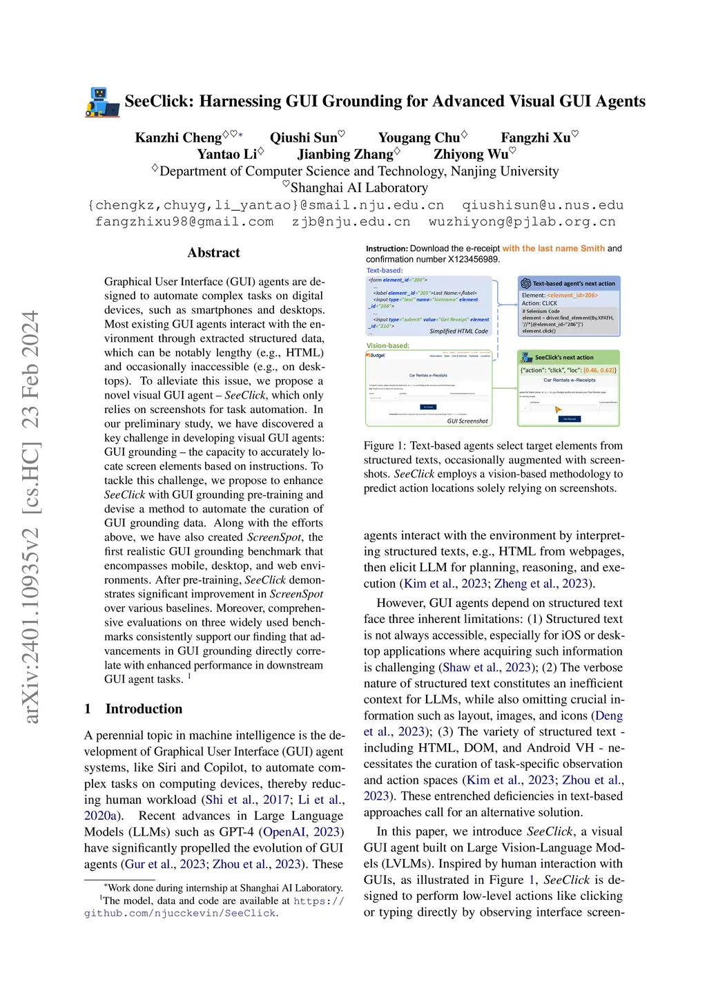 Graphical User Interface (GUI) agents are designed to automate complex tasks on digital devices, such as smartphones and desktops. Most existing GUI agents interact with the environment through extracted structured data, which can be notably lengthy (e.g., HTML) and occasionally inaccessible (e.g., on desktops). To alleviate this issue, we propose a novel visual GUI agent -- SeeClick, which only relies on screenshots for task automation. In our preliminary study, we have discovered a key challenge in developing visual GUI agents: GUI grounding -- the capacity to accurately locate screen elements based on instructions. To tackle this challenge, we propose to enhance SeeClick with GUI grounding pre-training and devise a method to automate the curation of GUI grounding data. Along with the efforts above, we have also created ScreenSpot, the first realistic GUI grounding benchmark that encompasses mobile, desktop, and web environments. After pre-training, SeeClick demonstrates significant improvement in ScreenSpot over various baselines. Moreover, comprehensive evaluations on three widely used benchmarks consistently support our finding that advancements in GUI grounding directly correlate with enhanced performance in downstream GUI agent tasks. The model, data and code are available at https://github.com/njucckevin/SeeClick.