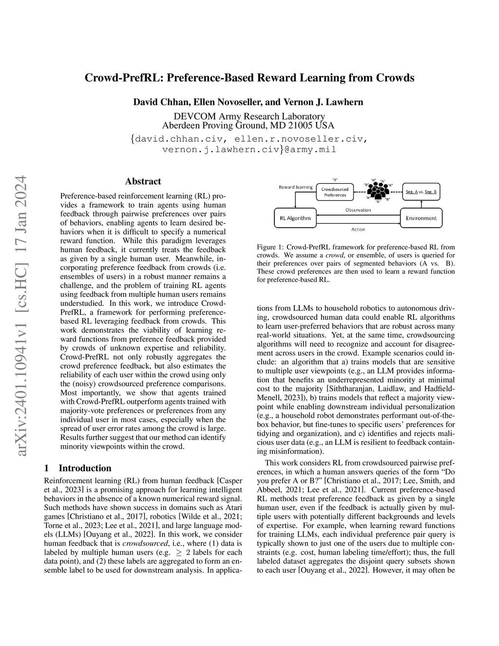 Preference-based reinforcement learning (RL) provides a framework to train AI agents using human feedback through preferences over pairs of behaviors, enabling agents to learn desired behaviors when it is difficult to specify a numerical reward function. While this paradigm leverages human feedback, it typically treats the feedback as given by a single human user. However, different users may desire multiple AI behaviors and modes of interaction. Meanwhile, incorporating preference feedback from crowds (i.e. ensembles of users) in a robust manner remains a challenge, and the problem of training RL agents using feedback from multiple human users remains understudied. In this work, we introduce a conceptual framework, Crowd-PrefRL, that integrates preference-based RL approaches with techniques from unsupervised crowdsourcing to enable training of autonomous system behaviors from crowdsourced feedback. We show preliminary results suggesting that Crowd-PrefRL can learn reward functions and agent policies from preference feedback provided by crowds of unknown expertise and reliability. We also show that in most cases, agents trained with Crowd-PrefRL outperform agents trained with majority-vote preferences or preferences from any individual user, especially when the spread of user error rates among the crowd is large. Results further suggest that our method can identify the presence of minority viewpoints within the crowd in an unsupervised manner.