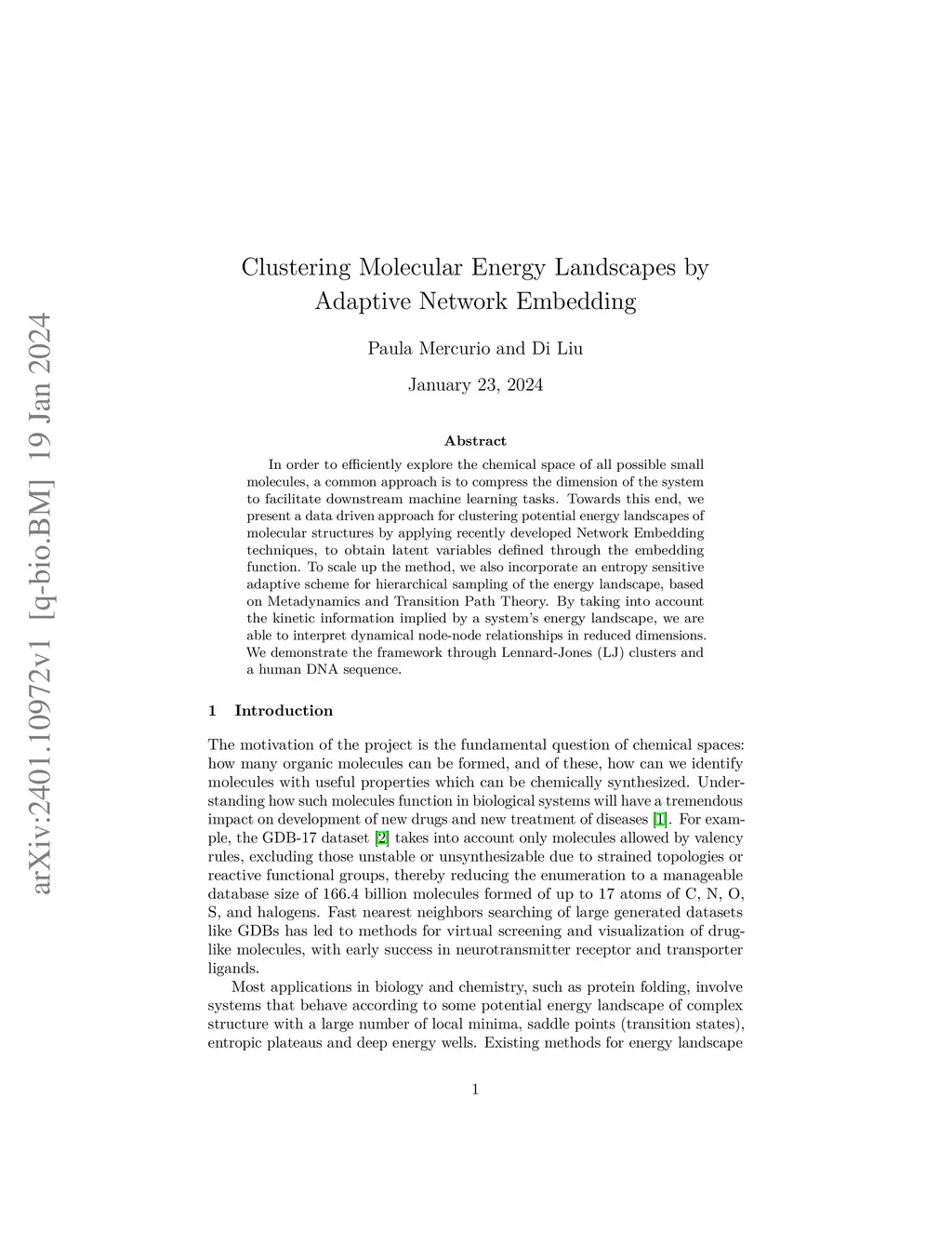 In order to efficiently explore the chemical space of all possible small molecules, a common approach is to compress the dimension of the system to facilitate downstream machine learning tasks. Towards this end, we present a data driven approach for clustering potential energy landscapes of molecular structures by applying recently developed Network Embedding techniques, to obtain latent variables defined through the embedding function. To scale up the method, we also incorporate an entropy sensitive adaptive scheme for hierarchical sampling of the energy landscape, based on Metadynamics and Transition Path Theory. By taking into account the kinetic information implied by a system's energy landscape, we are able to interpret dynamical node-node relationships in reduced dimensions. We demonstrate the framework through Lennard-Jones (LJ) clusters and a human DNA sequence.