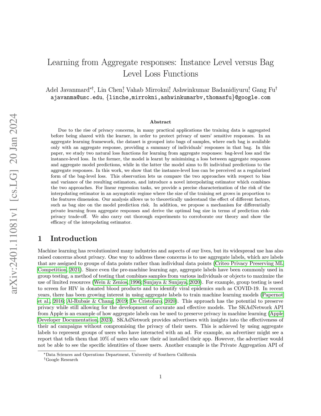 Due to the rise of privacy concerns, in many practical applications the training data is aggregated before being shared with the learner, in order to protect privacy of users' sensitive responses. In an aggregate learning framework, the dataset is grouped into bags of samples, where each bag is available only with an aggregate response, providing a summary of individuals' responses in that bag. In this paper, we study two natural loss functions for learning from aggregate responses: bag-level loss and the instance-level loss. In the former, the model is learnt by minimizing a loss between aggregate responses and aggregate model predictions, while in the latter the model aims to fit individual predictions to the aggregate responses. In this work, we show that the instance-level loss can be perceived as a regularized form of the bag-level loss. This observation lets us compare the two approaches with respect to bias and variance of the resulting estimators, and introduce a novel interpolating estimator which combines the two approaches. For linear regression tasks, we provide a precise characterization of the risk of the interpolating estimator in an asymptotic regime where the size of the training set grows in proportion to the features dimension. Our analysis allows us to theoretically understand the effect of different factors, such as bag size on the model prediction risk. In addition, we propose a mechanism for differentially private learning from aggregate responses and derive the optimal bag size in terms of prediction risk-privacy trade-off. We also carry out thorough experiments to corroborate our theory and show the efficacy of the interpolating estimator.