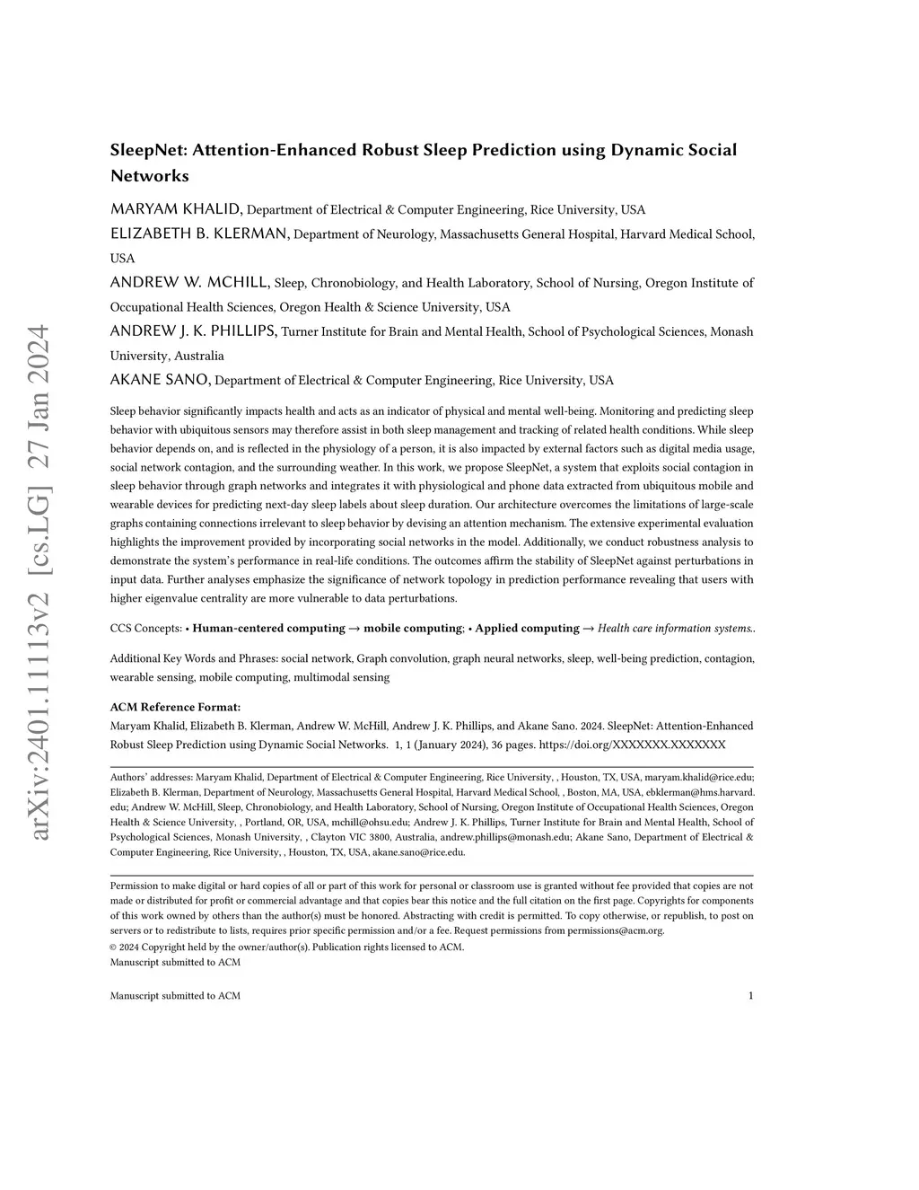 Sleep behavior significantly impacts health and acts as an indicator of physical and mental well-being. Monitoring and predicting sleep behavior with ubiquitous sensors may therefore assist in both sleep management and tracking of related health conditions. While sleep behavior depends on, and is reflected in the physiology of a person, it is also impacted by external factors such as digital media usage, social network contagion, and the surrounding weather. In this work, we propose SleepNet, a system that exploits social contagion in sleep behavior through graph networks and integrates it with physiological and phone data extracted from ubiquitous mobile and wearable devices for predicting next-day sleep labels about sleep duration. Our architecture overcomes the limitations of large-scale graphs containing connections irrelevant to sleep behavior by devising an attention mechanism. The extensive experimental evaluation highlights the improvement provided by incorporating social networks in the model. Additionally, we conduct robustness analysis to demonstrate the system's performance in real-life conditions. The outcomes affirm the stability of SleepNet against perturbations in input data. Further analyses emphasize the significance of network topology in prediction performance revealing that users with higher eigenvalue centrality are more vulnerable to data perturbations.